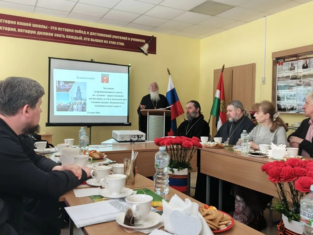 23 марта 2026 года в городе Людиново на базе средней школы №2 состоялось расширенное заседание муниципального координационного совета по духовно – нравственному воспитанию детей и молодёжи при администрации Людиновского муниципального округа. Участниками заседания были: глава Администрации Людиновского муниципального округа Геннадий Евгеньевич Ананьев; Епископ Козельский и Людиновский Макарий, сопредседатель координационного совета; Людмила Александровна Дюкова — и.о. заместителя главы Администрации Людиновского муниципального округа; Марина Анатольевна Денисова — начальник Управления образования Администрации Людиновского муниципального округа, заместитель сопредседателя координационного совета; протоиерей Алексий Жиганов — благочинный 6 (Людиновского) округа Козельской епархии, настоятель Казанского собора г. Людиново, заместитель сопредседателя координационного совета; Муравьева Марина Анатольевна — ведущий специалист отдела мониторинга Управления образования Администрации Людиновского муниципального округа, секретарь; а также духовенство Людиновского благочиния, члены муниципального координационного Совета по духовно – нравственному воспитанию детей и молодёжи при администрации Людиновского муниципального округа.