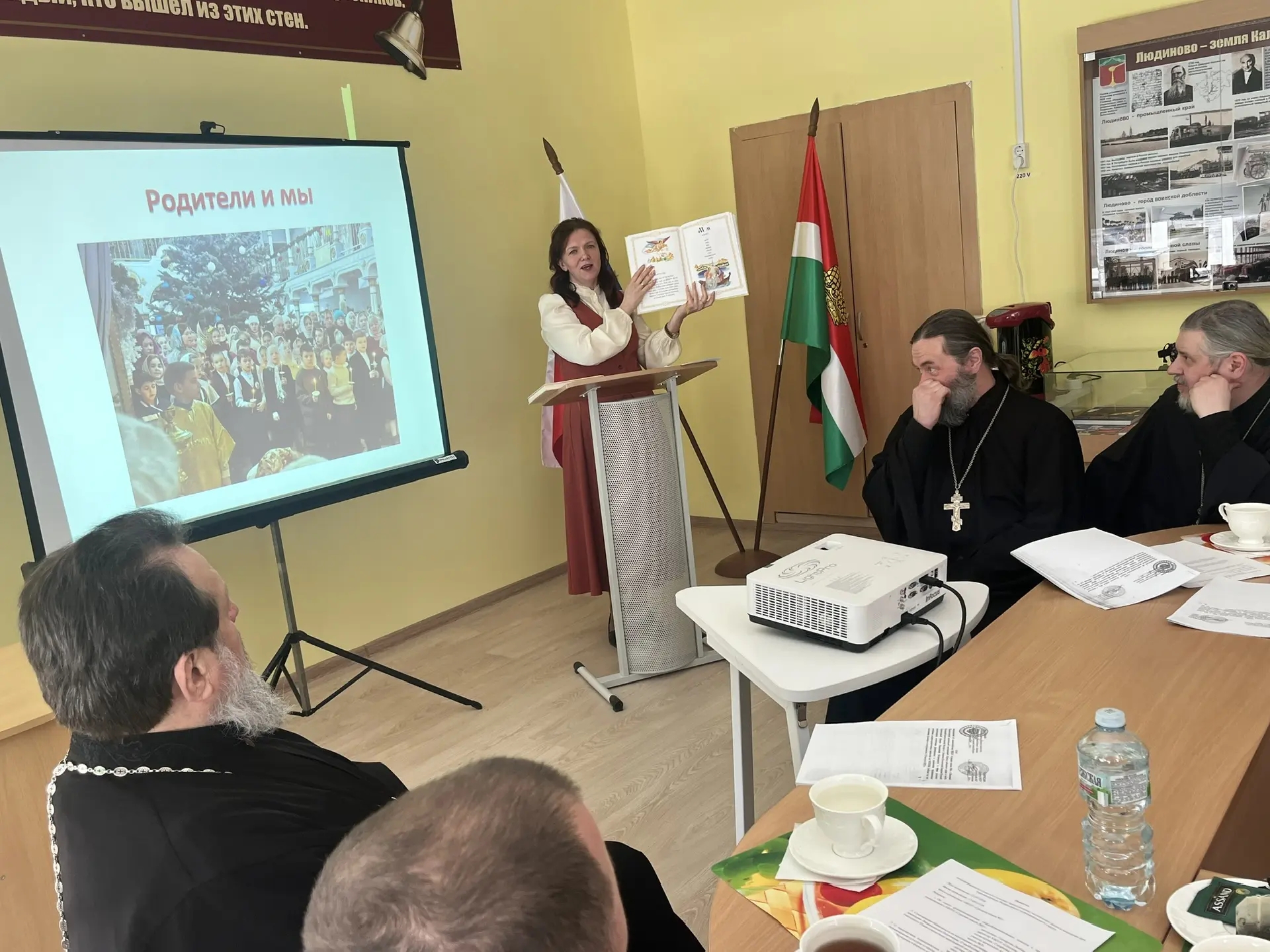 По первому вопросу «Об опыте функционирования общеобразовательных классов с православным компонентом в МКОУ «Средняя школа №2» выступила Любовь Васильевна Гончарова, директор Средней школы №2 Людинова, представив презентацию опыта организации и деятельности православных классов. Любовь Васильевна отметила важность соработничества школы, родителей и духовенства, а также обратила внимание на грамотное обеспечение нормативно – организационной базой для функционирования таких классов в соответствие с Законодательством РФ. Содокладчик Наталья Васильевна Смирнова, учитель начальных классов, раскрыла особенности реализации православных компонентов в урочной и неурочной деятельности классов.