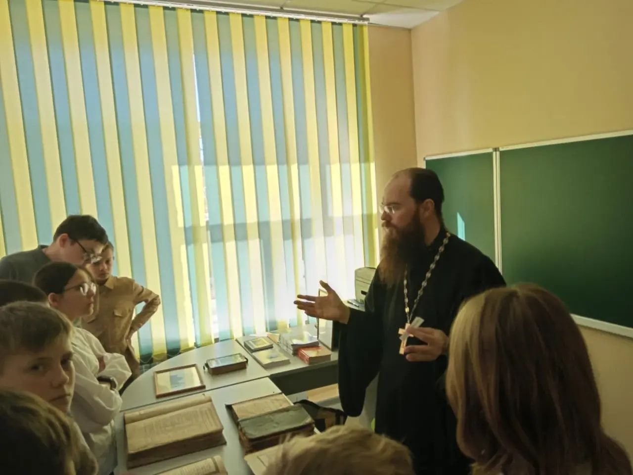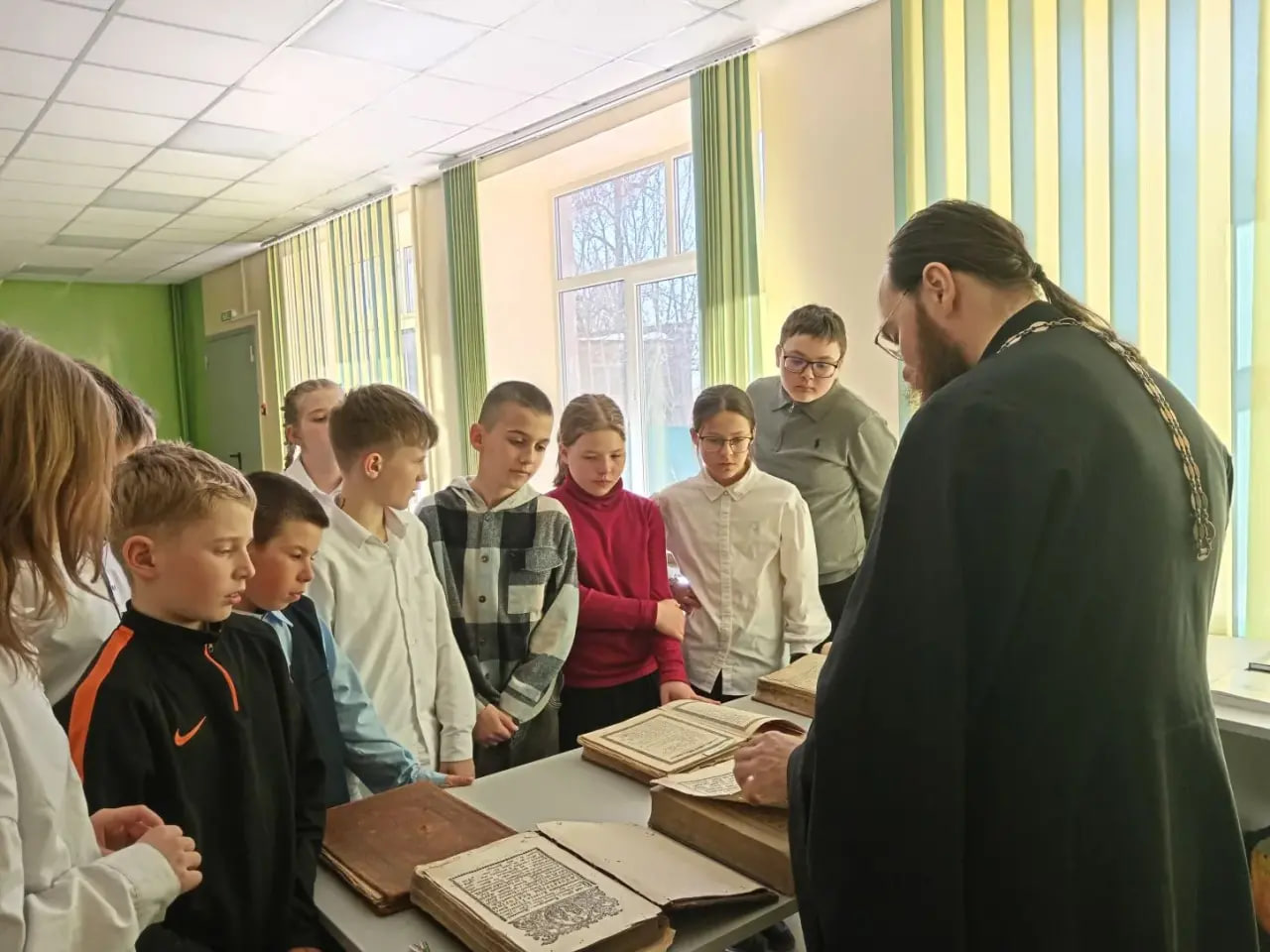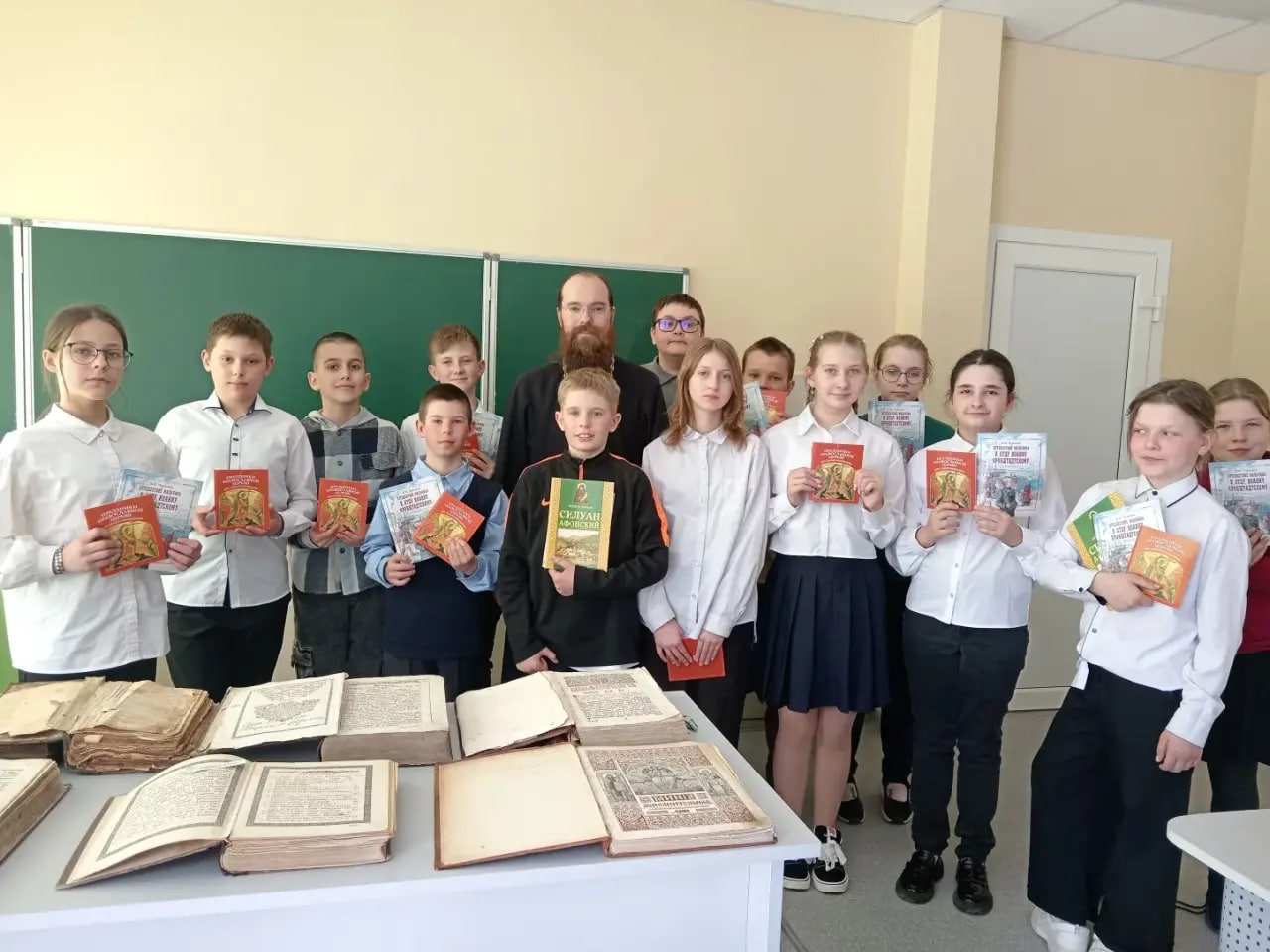 По приглашению директора и педагогов школы, для учащихся 4,5,6 классов занятие провел иерей Тихон Худяков, настоятель храма в честь Преображения Господня села Нижние Прыски. Ребятам было рассказано о книгопечатании в истории нашей родины и особенном значении Православной книги. Также учащимся была представлена экспозиция старинных богослужебных книг местного храма. В том числе издания конца 18 – начала 20 века.