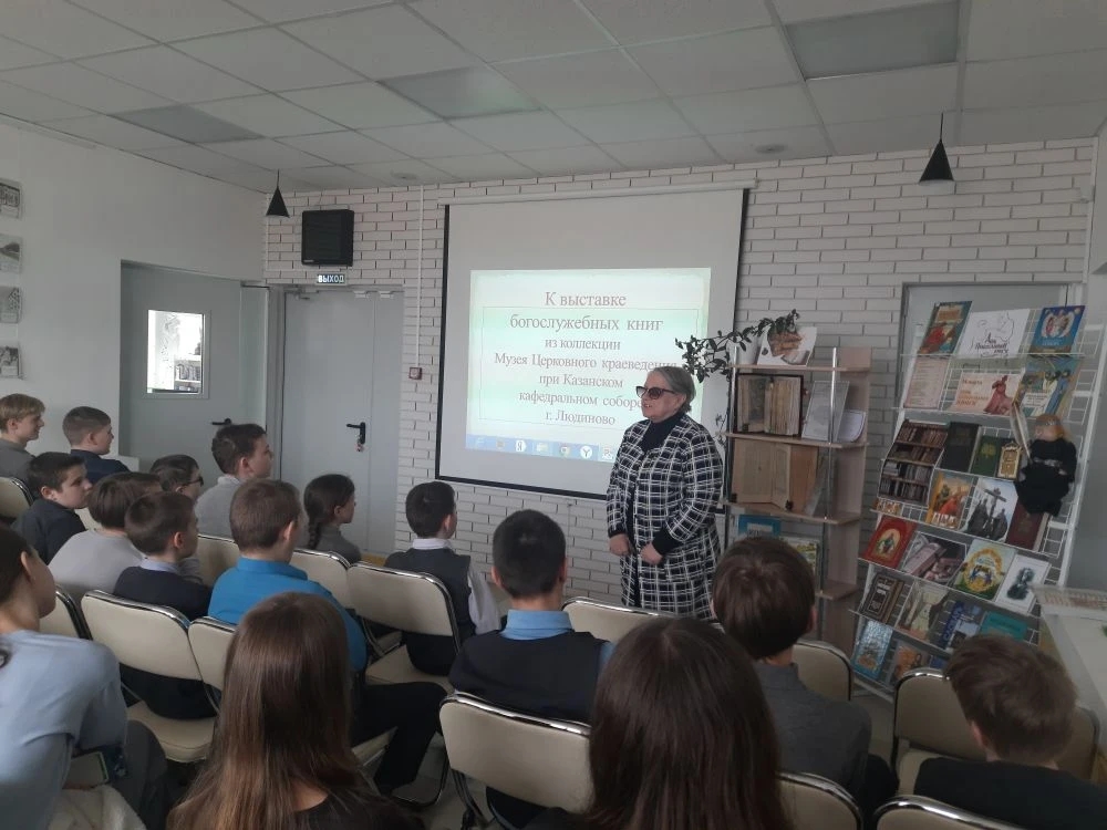 На следующую встречу со школьниками, учениками 5-го и 6-го класса средней школы №1 города Людиново, священник был приглашён в Людиновскую центральную детскую модельную библиотеку, где прошло мероприятие «Живой родник Православной книги». Насыщенную программу по истории создания книги, о книгопечатании, о старинных книгах подготовили методист библиотеки Елена Владимировна Петрова и сотрудник, хранитель фондов музея Церковно – исторического краеведения при Казанском соборе города Людиново Галина Федоровна Гончарова.