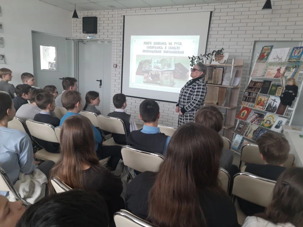 Галина Федоровна, используя интересную презентацию и некоторые, принесённые из церковного музея материалы и старинные книги, очень подробно рассказала юным слушателям, с чего начиналось книгопечатание в России, о первом русском книгопечатнике Иване Фёдорове, о создании первой печатной книги — «Апостол», об изготовлении бумаги, о нанесении водяного знака – филиграни, о знаках с портретами правителей тех времён, коронами и колоколами, щитами и якорями, цветами и деревьями, гербами, а также о старинных богослужебных старопечатных книгах от XVII до XX веков.