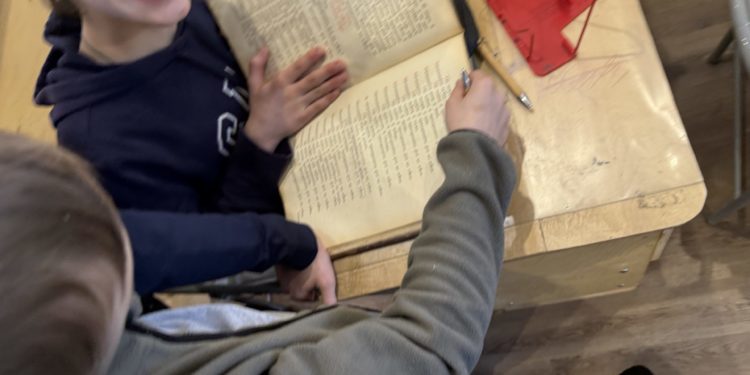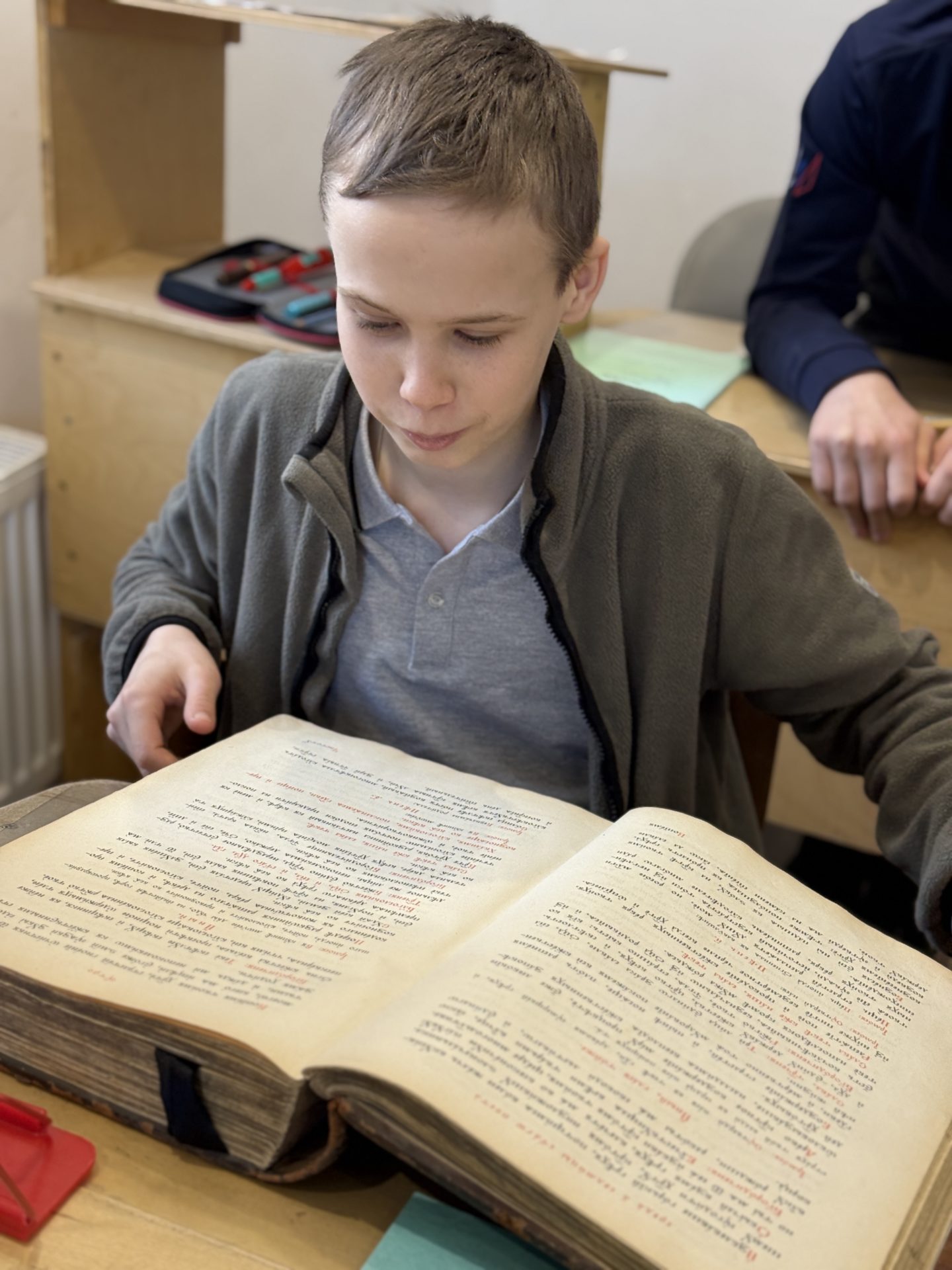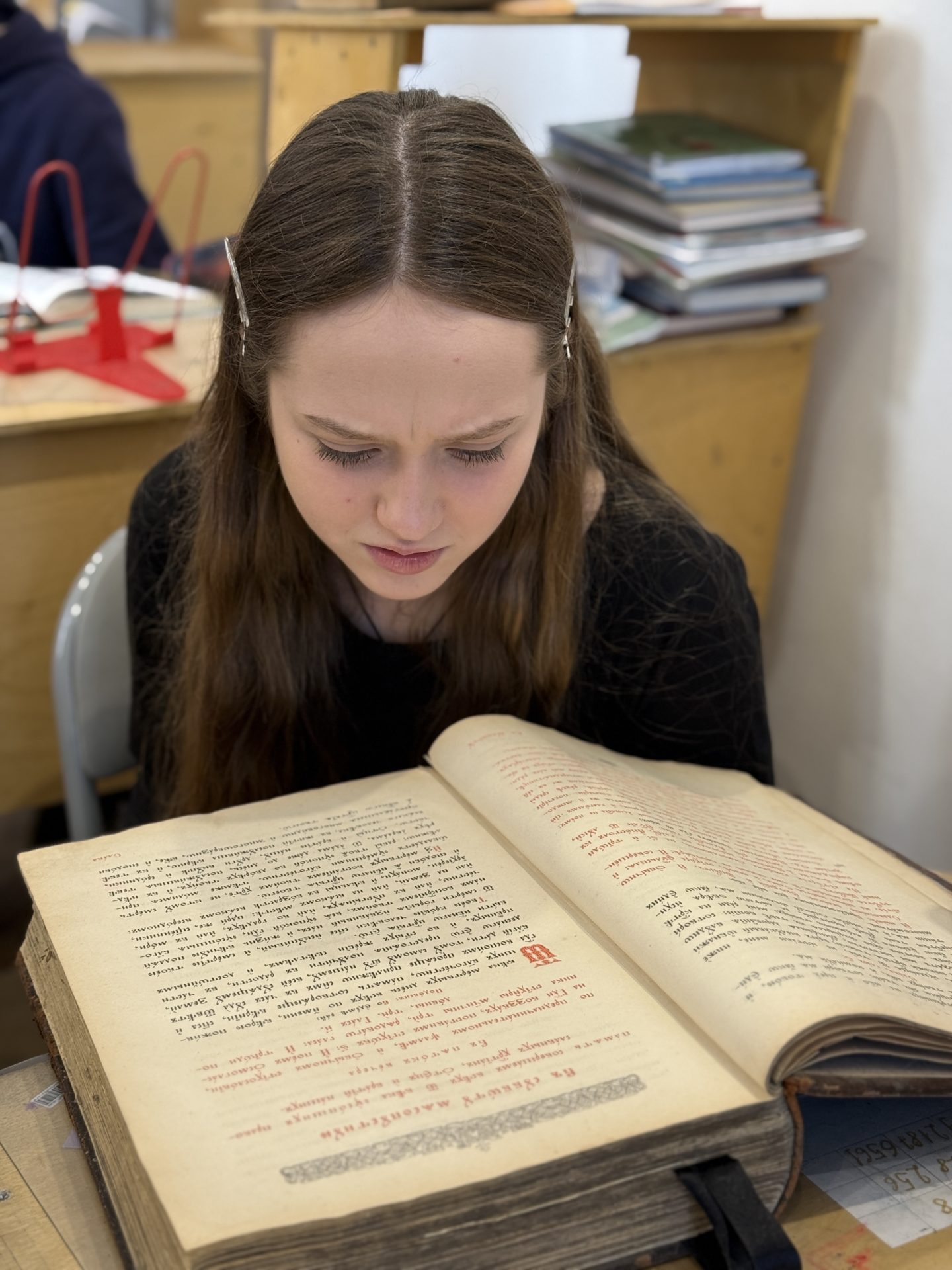 Второй частью открытого урока стало наглядное знакомство учащихся с дореволюционными богослужебными книгами и чтение по ним. Дети с увлечением отыскивали и расшифровывали годы выпуска книг, сопоставляли указанных в выходных данных императоров со своими историческими знаниями, читали отрывки из Триоди, Минеи и Псалтири.