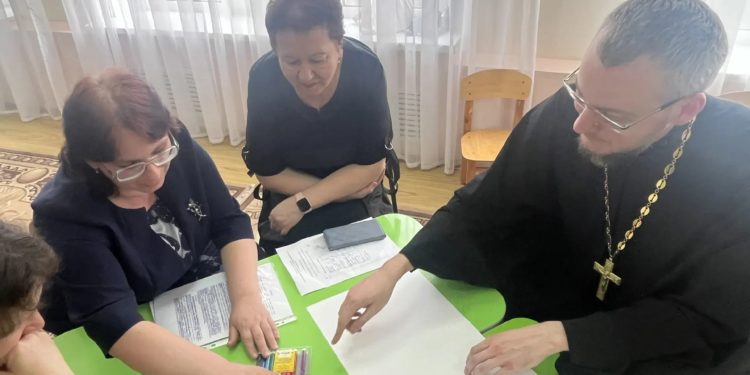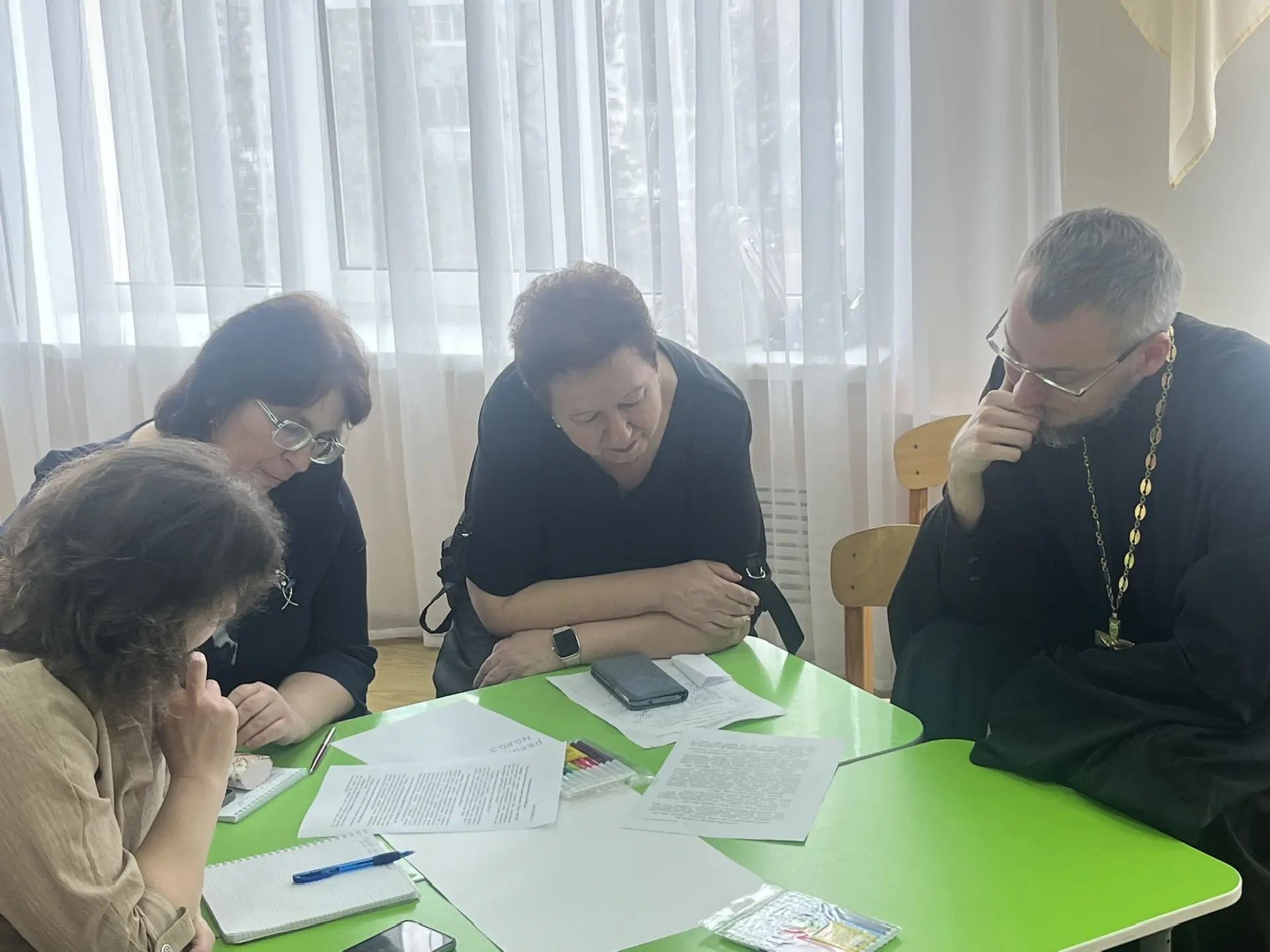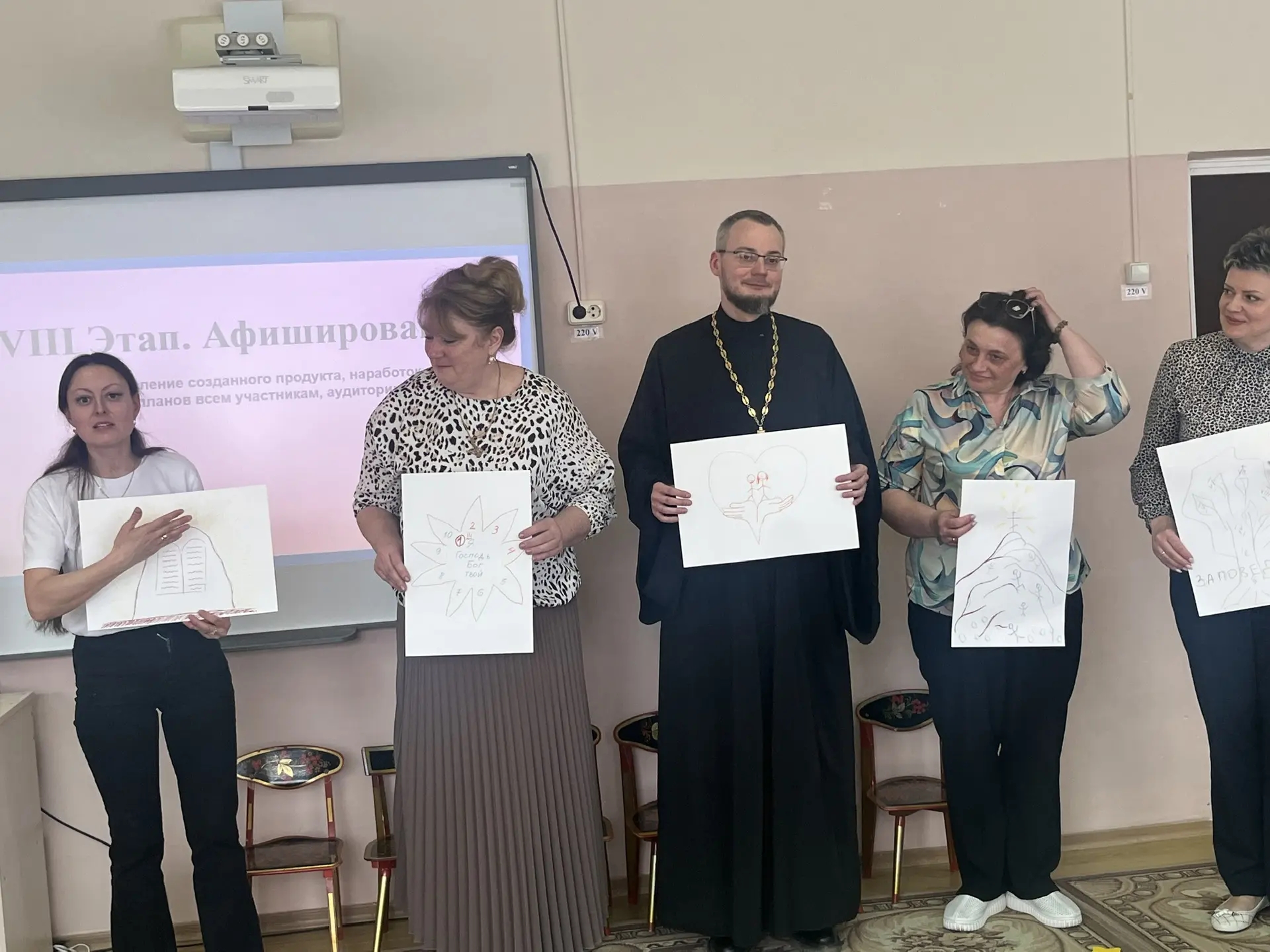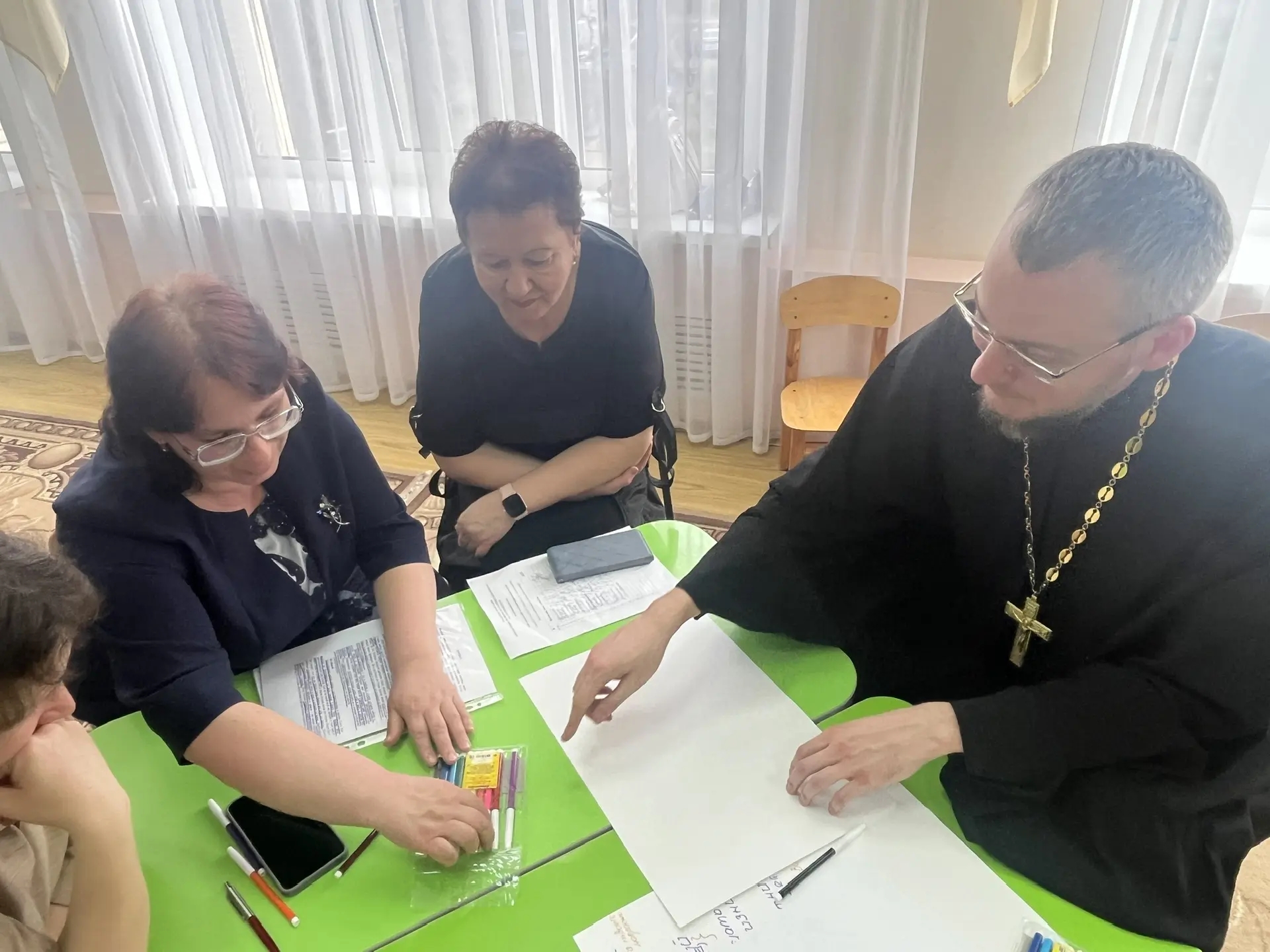 1 апреля 2026 года в Детском саду №3 «Аленький цветочек» города Людиново педагоги средней школы №2 города Ольга Клестова и Светлана Романенко провели для работников дошкольных образовательных организаций педагогическую мастерскую «Нравственные ориентиры». На встречу с педагогическими работниками был приглашён клирик Казанского собора города Людиново иерей Алексий Сначёв.