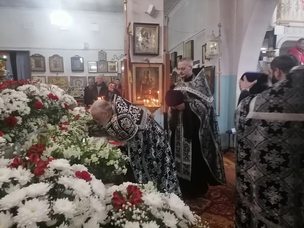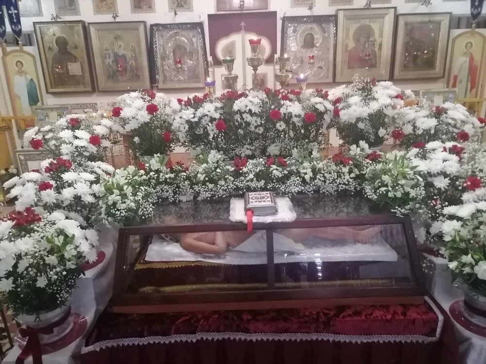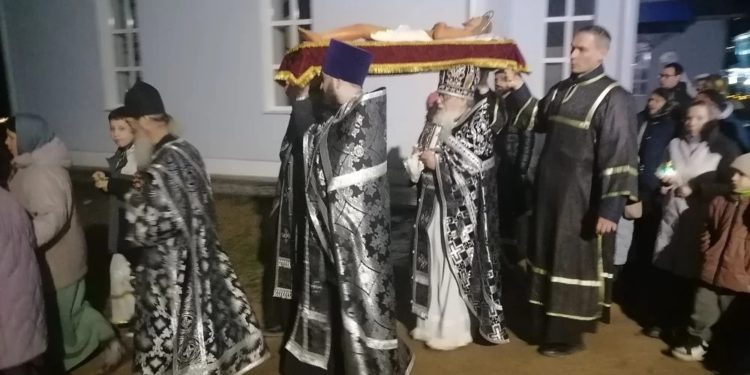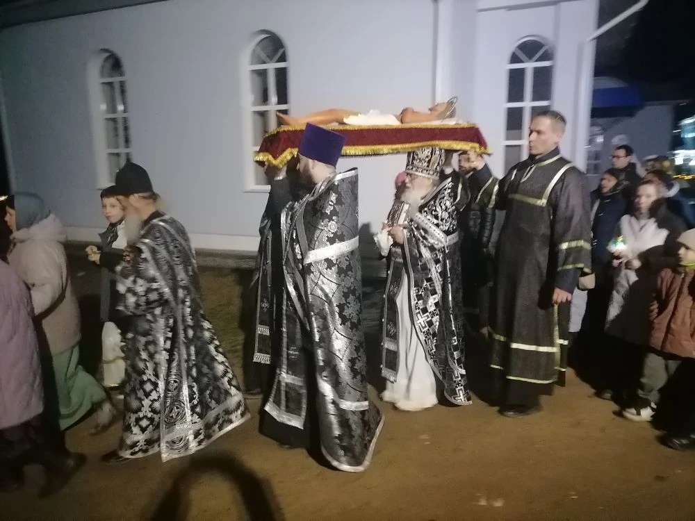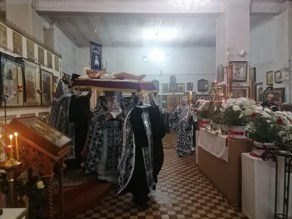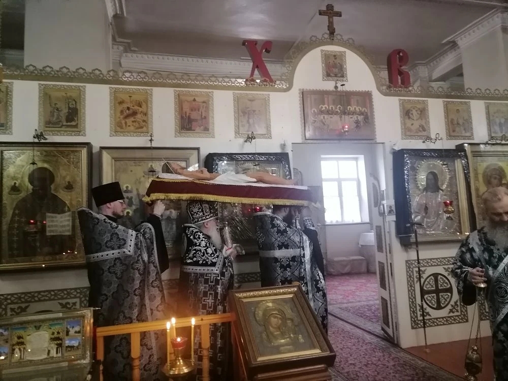В завершение вечерни, при пении тропарей «Благообразный Иосиф, с древа снем Пречистое Тело Твое», в преднесении возженных свечей и при каждении фимиамом, с Престола, как бы с Голгофы, священнослужители вынесли из алтаря Плащаницу с фигурой Христа. Это особая старинная Плащаница, представляющая собой резную фигуру Спасителя. Она была возложена на украшенной цветами гробнице в центре храма; по бокам были установлены кадильницы с горящим углем и фимиамом.