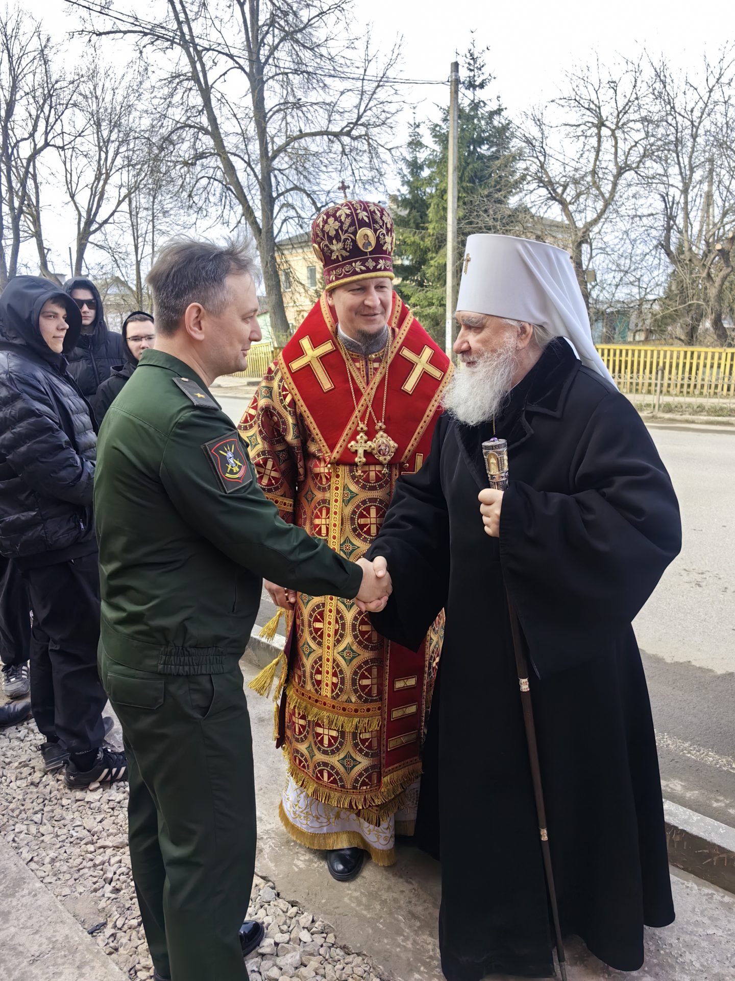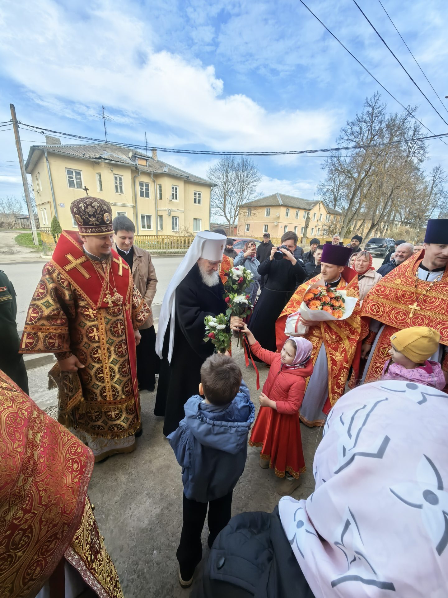 У Благовещенского храма архипастырей поздравили с праздником Пасхи воспитанники Козельской православной гимназии во главе с директором Т.Ю. Шмыревой и духовником гимназии священником Сергием Барыкиным. Хор гимназии исполнил пасхальные песнопения, а гимназисты вручили архипастырям подарки, изготовленные собственными руками.