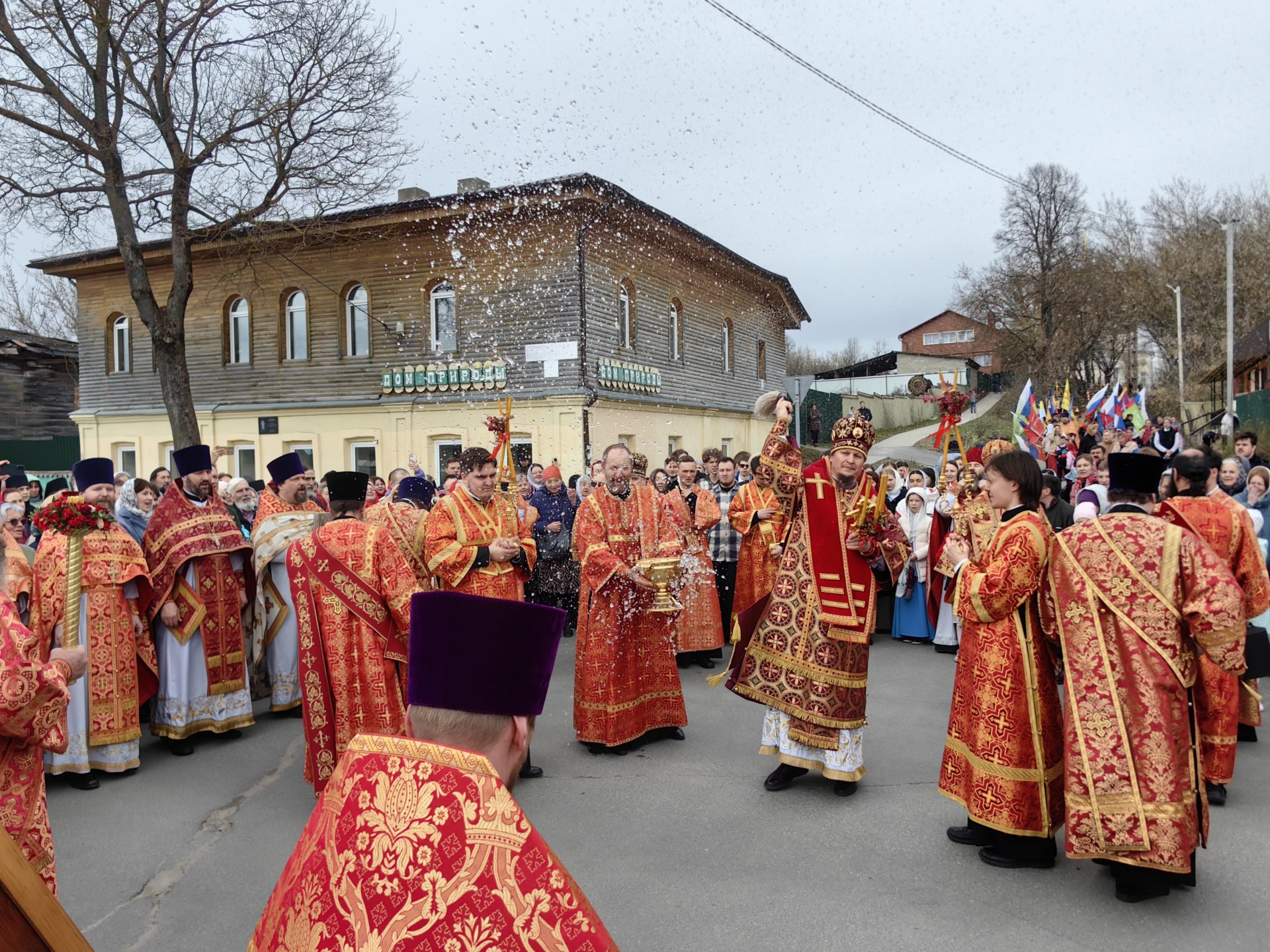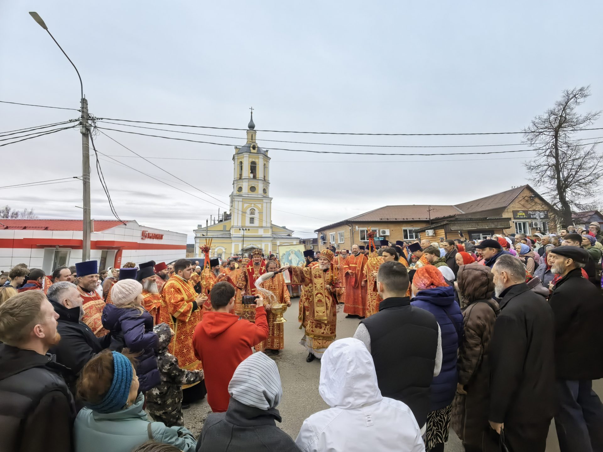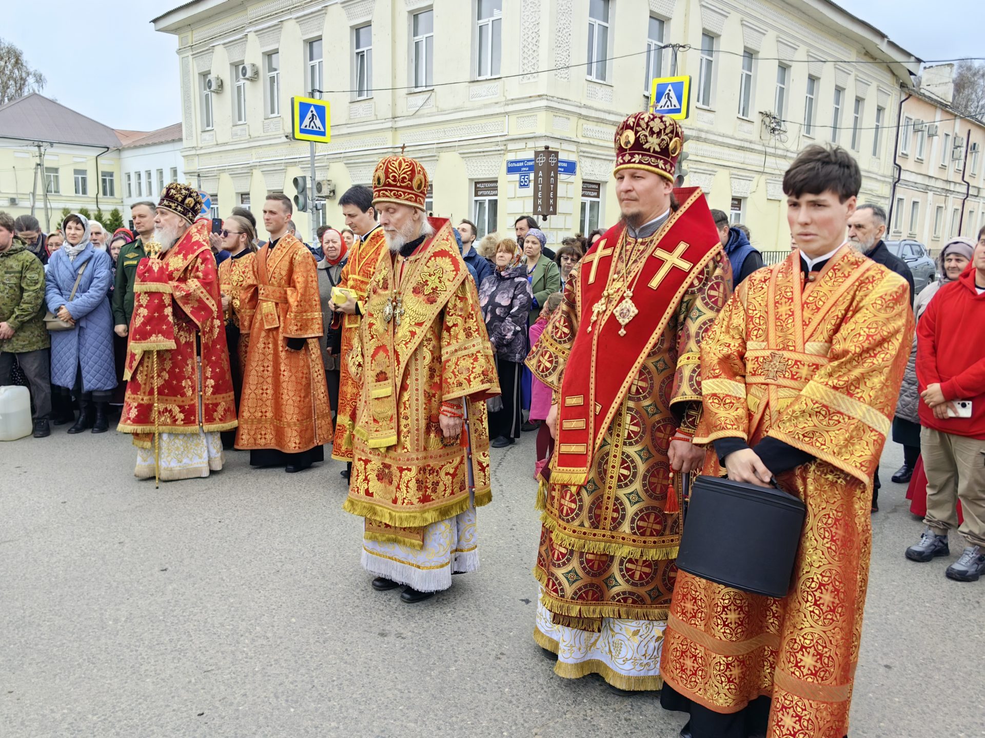 По окончании Божественной Литургии Крестный ход отправился из Успенского кафедрального собора в сторону Благовещенского храма.