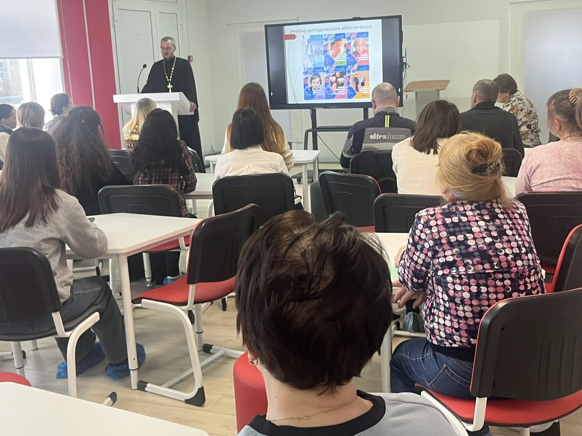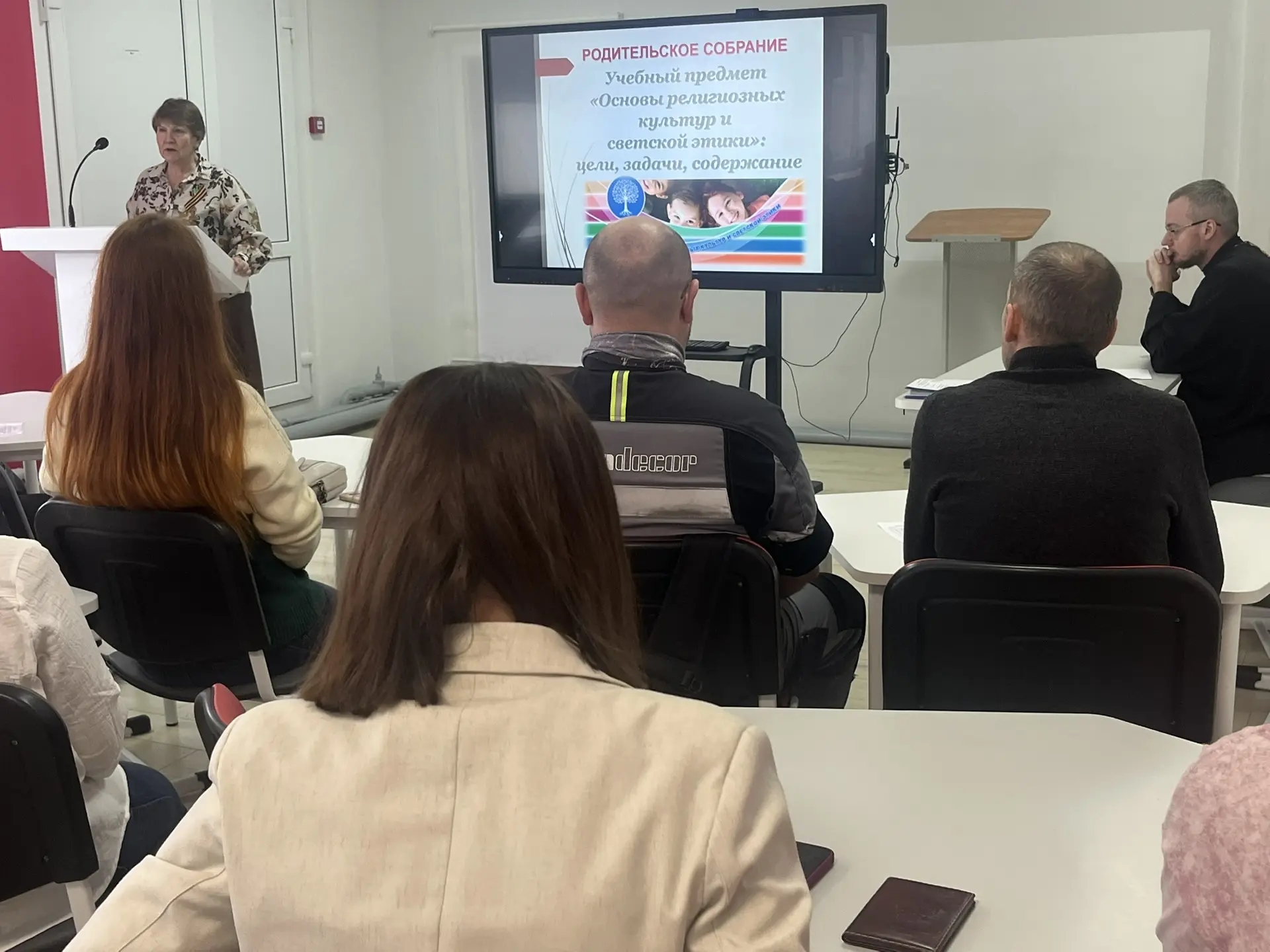 Перед родителями выступили директор школы Любовь Васильевна Гончарова, заместитель директора и учитель ОРКСЭ Ольга Сергеевна Клестова, клирик Казанского собора иерей Алексей Сначев. Выступающие объяснили родителям нормативно-правовые основы и цели изучения предмета ОРКСЭ в 4 классе, особенности преподавания духовно- нравственной дисциплины. На примере одной из серий фильма «Девочка и робот» познакомили с особенностями содержания курса и построения урока Основ православной культуры.