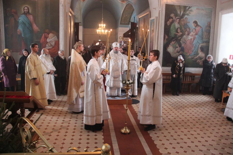После отпуста литургии священнослужители в центре храма перед возженной свечей совершили славление праздника Рождества Христова, а затем владыка обратился к богомольцам с проповедью.