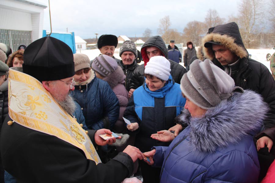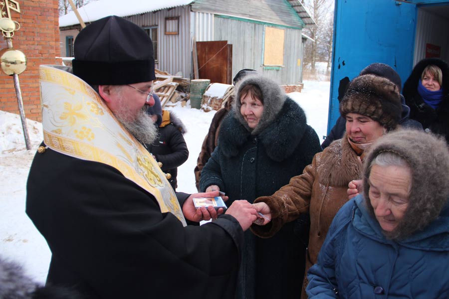 Храм в селе строится на пожертвования православных благотворителей. В завершении чина освящения крестов владыка поздравил жителей села собравшихся на столь значимое событие и вручил каждому в благословение образок Пресвятой Богородицы.