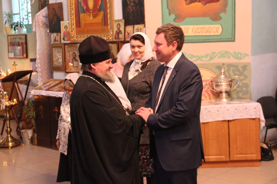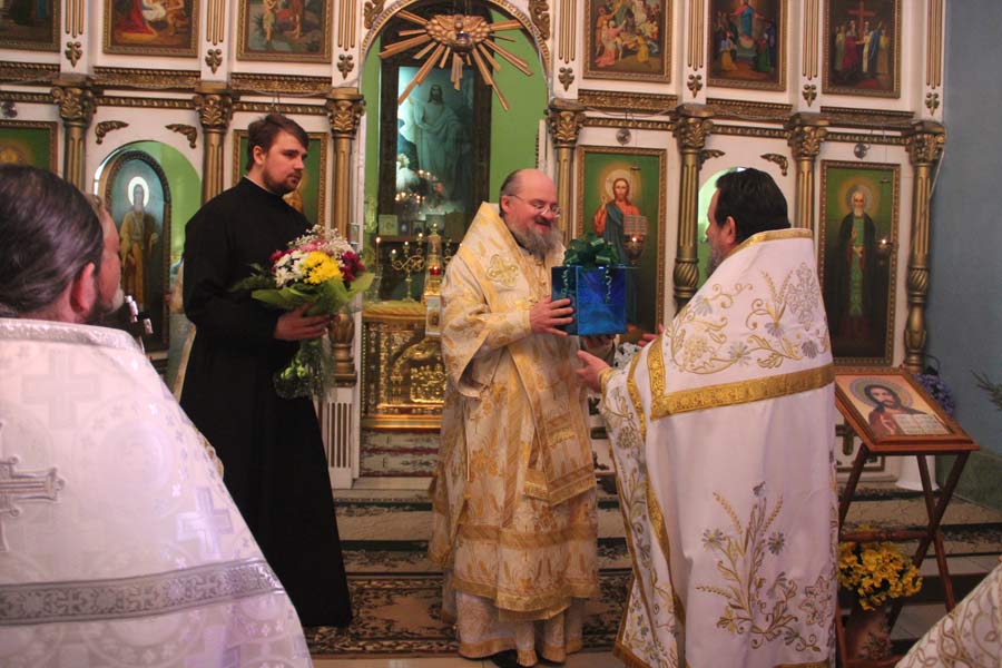 Архипастырь поздравил настоятеля храма протоиерея Василия Биляка с днем тезоименитства и преподнес ему подарок и букет цветов со словами благодарности за его подвижнический многолетний труд на приходе. Владыка также поздравил с праздником Рождества Христова и наступившим новолетием главу района Даниила Михайловича Аганичева, поблагодарив его за внимание к нуждам православных верующих Людиновского района. В свою очередь, Даниил Михайлович обратился к прихожанам со словами поздравления с великим праздником Рождества Христова.