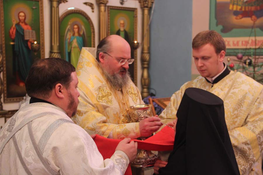 После евхаристического канона владыка совершил диаконскую хиротонию студента третьего курса сектора заочного обучения Калужской духовной семинарии Леонова Олега. По отпусте литургии священнослужители совершили молебное пение на начало нового 2016 года, начавшегося в этот день по юлианскому календарю и славление святителю Василию Великому архиепископу Кесарии Каппадокийской. Затем владыка обратился к богомольцам с проповедью.