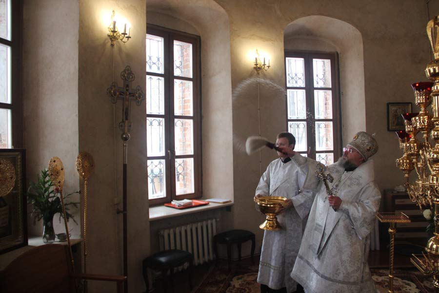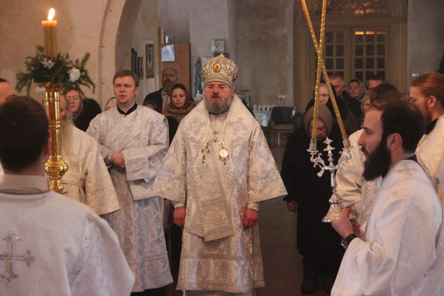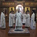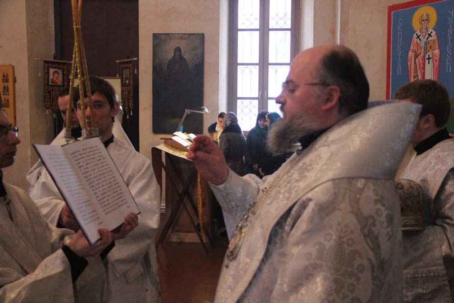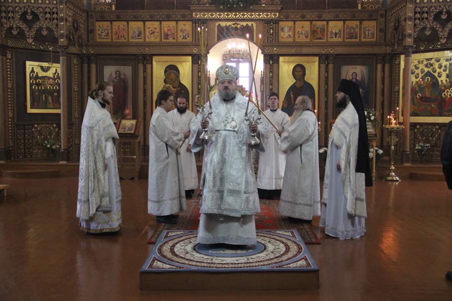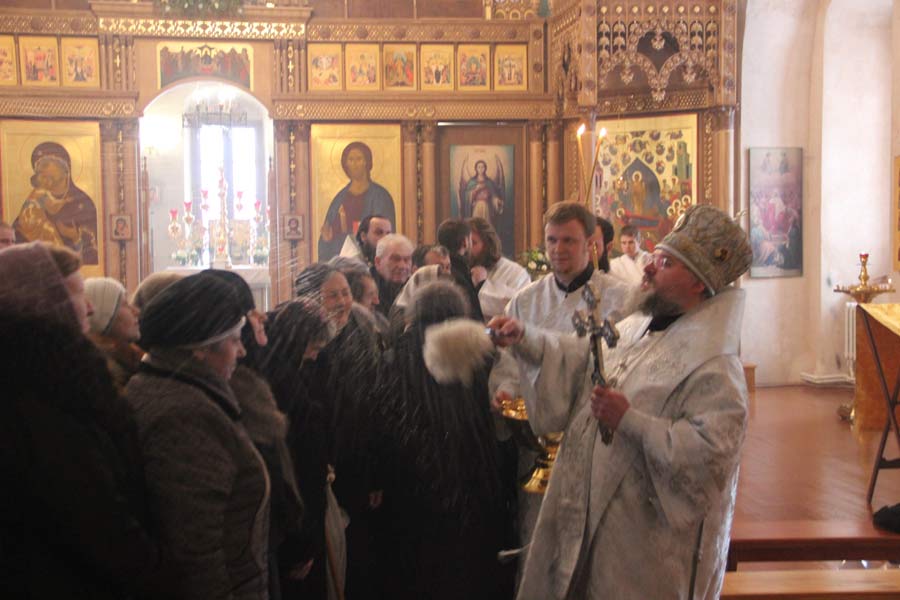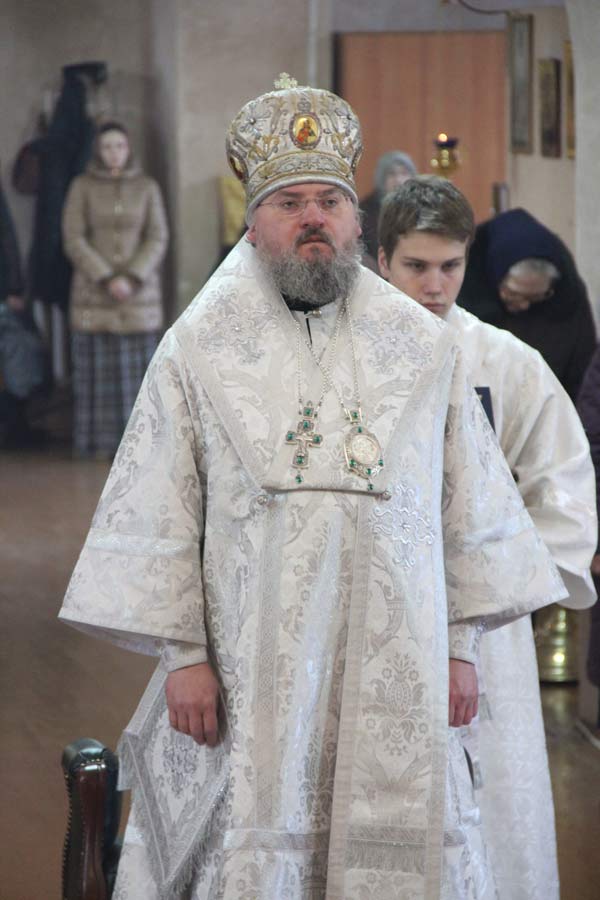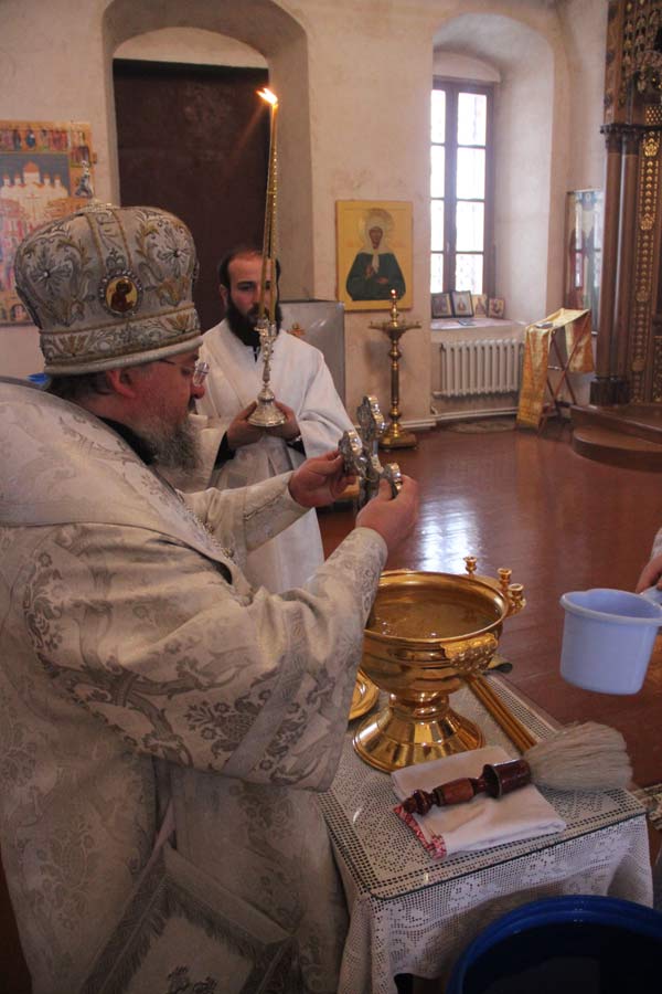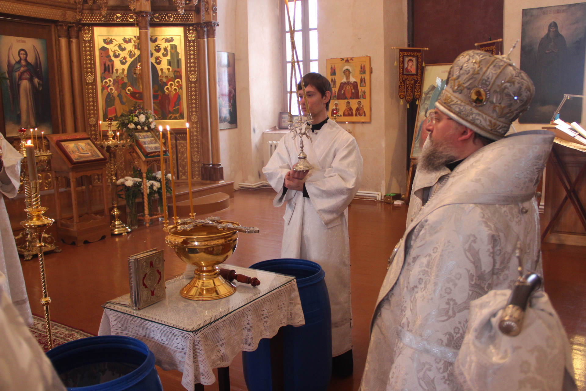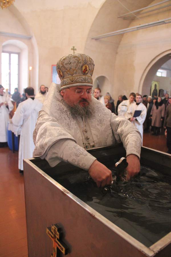 Архипастырю сослужили: настоятель собора иеромонах Паисий (Курмаз), иерей Елисей Тимофеев и диакон Евгений Ковригин. По заамвонной молитве был совершен чин великого освящения воды, а затем владыка обратился к молящимся с архипастырским словом.
