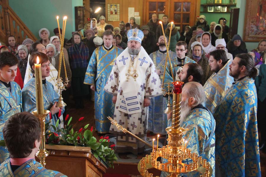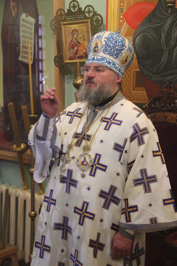 По отпусте литургии священнослужители совершили славление праздника Сретения Господня, а затем владыка обратился к богомольцам с проповедью.