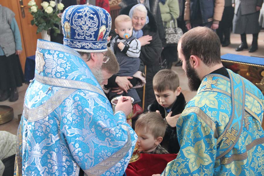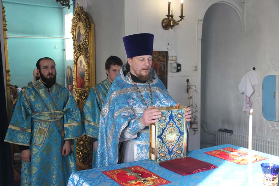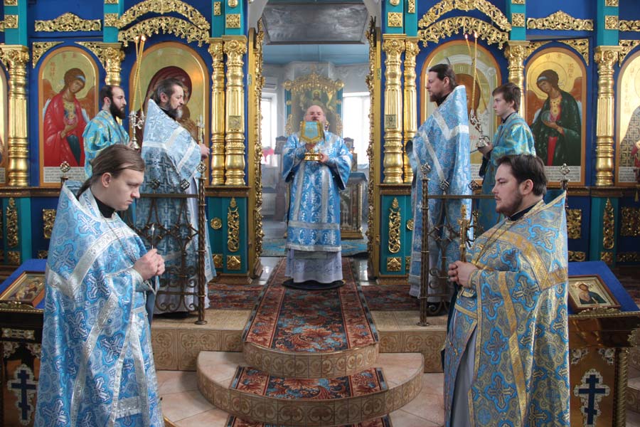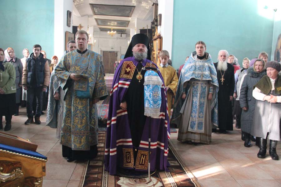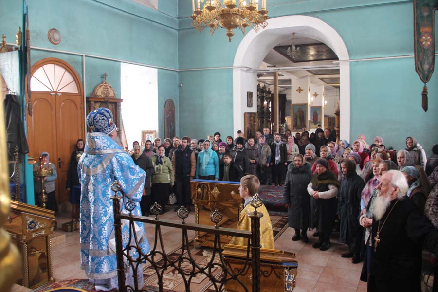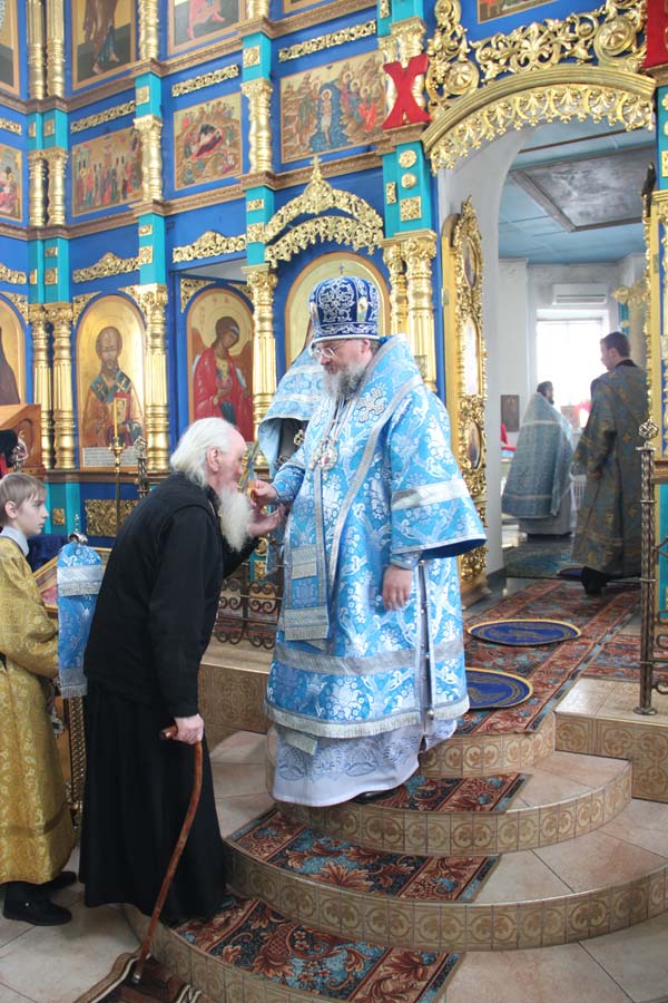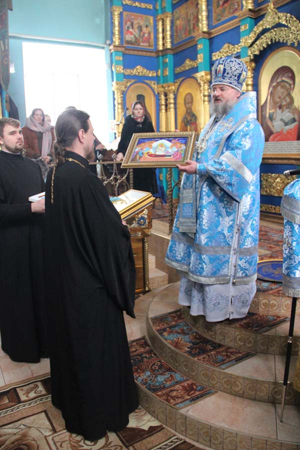 Архипастырю сослужили: настоятель храма, благочинный округа протоиерей Алексий Казаков, протоиерей Иоанн староста, иерей Антоний Хатунцев, иерей Стефан Колбасин и диакон Евгений Ковригин. За богослужением молился почетный настоятель храма митрофорный протоиерей Николай Казаков.