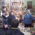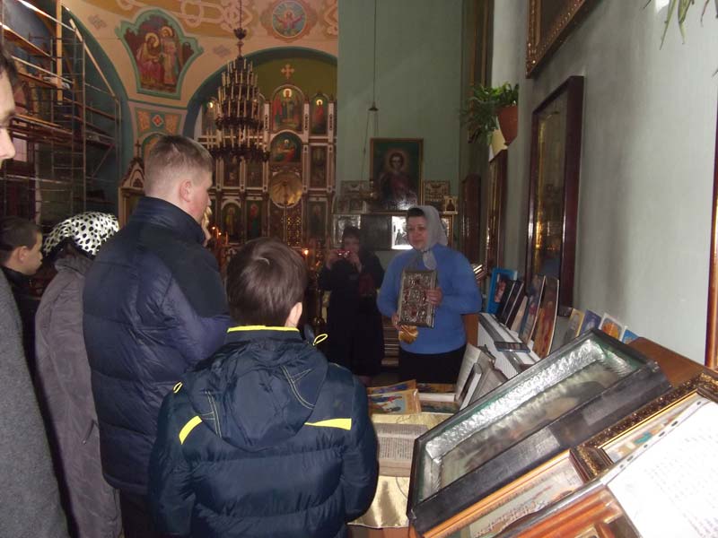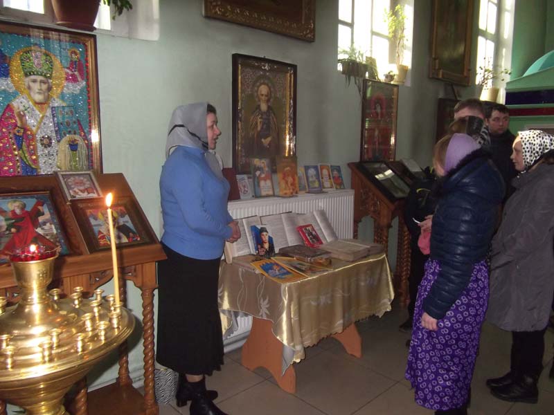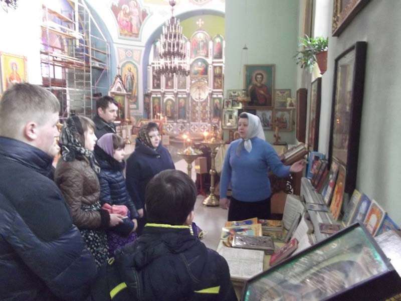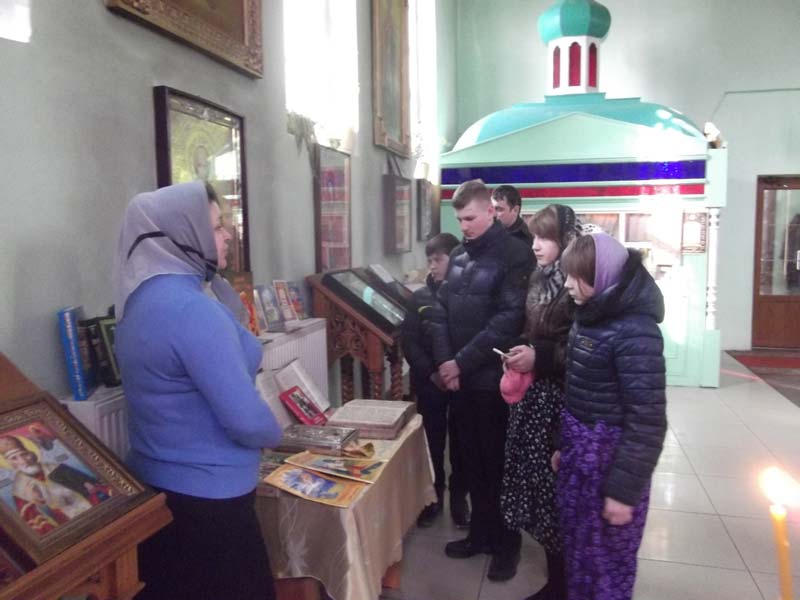 Преподаватель воскресной школы «Радонеж» Клячина Т.И. рассказала ребятам о том, когда Священным синодом было установлено празднование Дня православной книги, и какому событию он был приурочен. Так же рассказала о Богослужебных книгах, о книгах современных авторов, особое внимание обратила на книгу В.Покровского «Он выбрал крест». Затем рассказала учащимся об истории храма.