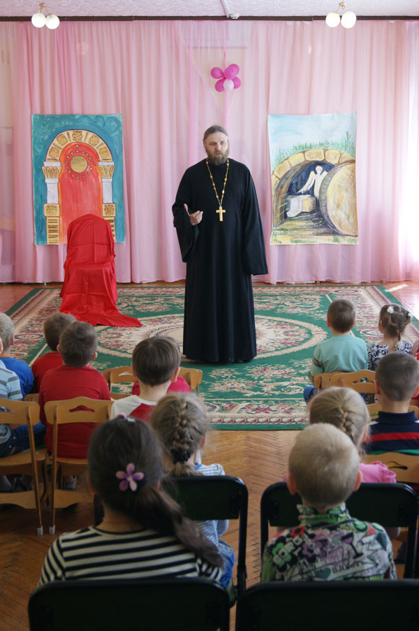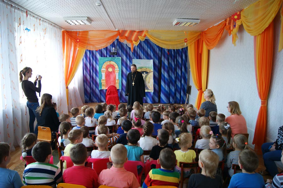 В обоих детских садах перед выступлением гимназистов с приветственным словом к воспитанникам обратился помощник командира дивизии по воспитательной работе, руководитель епархиального отдела по взаимодействию с вооруженными силами, настоятель храма в честь Воскресения Христова в г. Козельске иерей Николай Кузнецов.