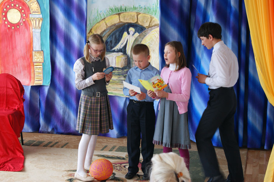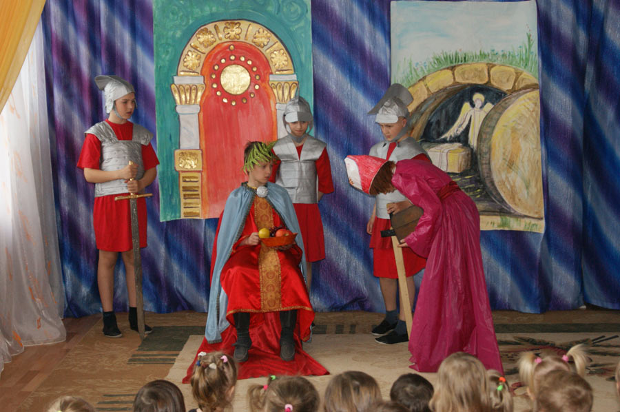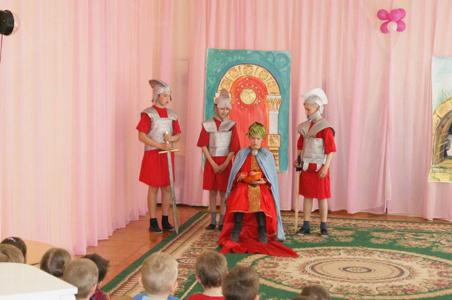 По приглашению администрации детских садов «Ладушка» и «Теремок» воспитанники Козельской Православной гимназии устроили настоящее пасхальное торжество: спели пасхальные песнопения, показали спектакль, поздравили детей с Воскресением Христовым.