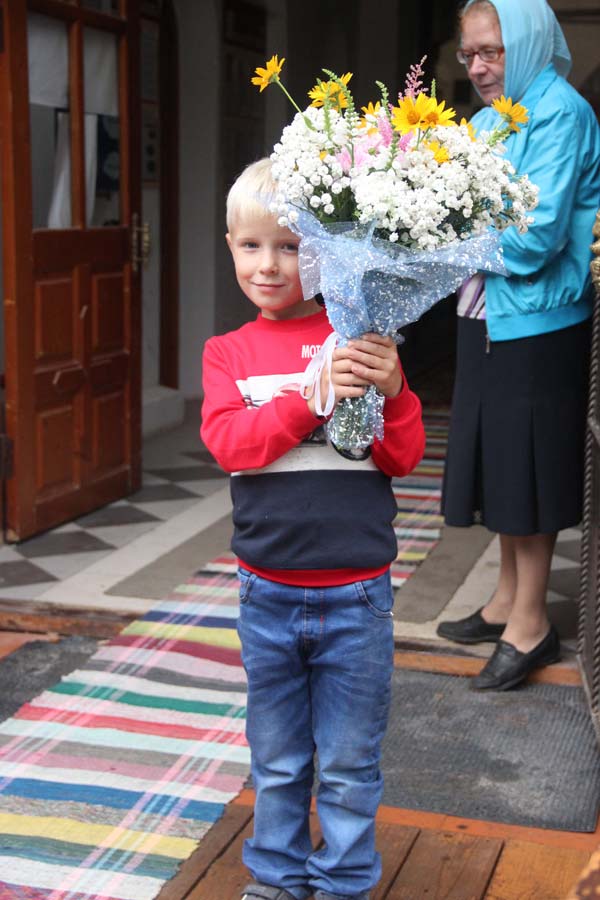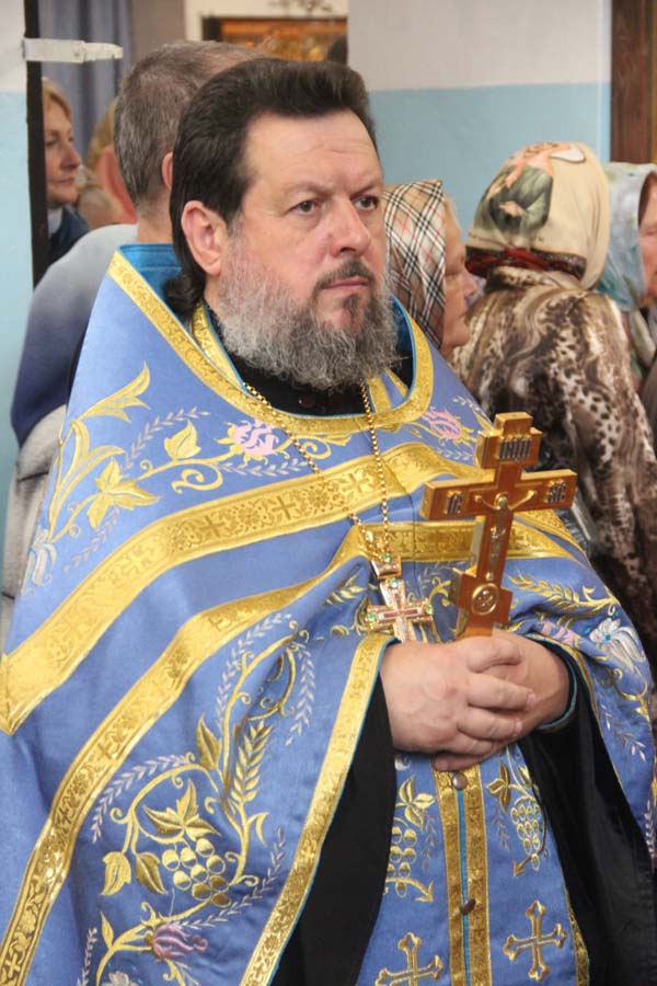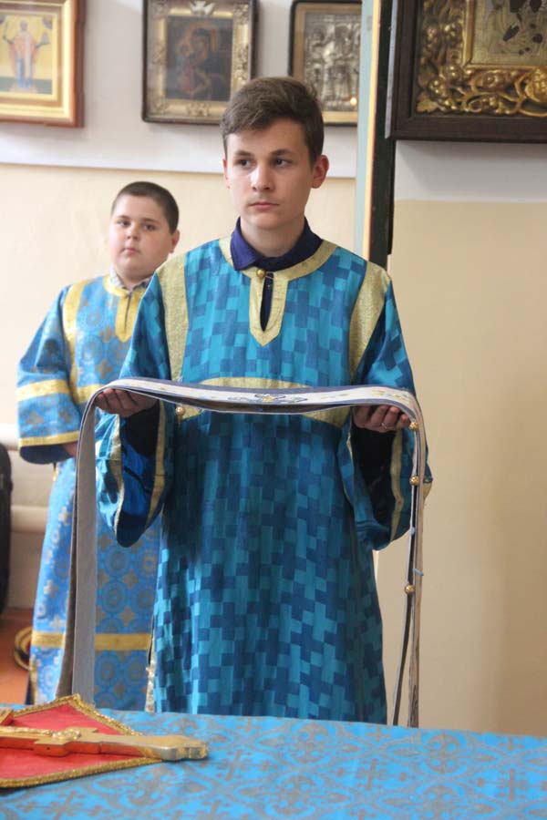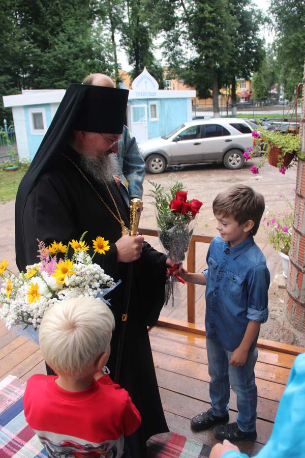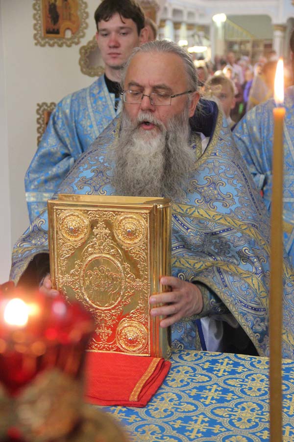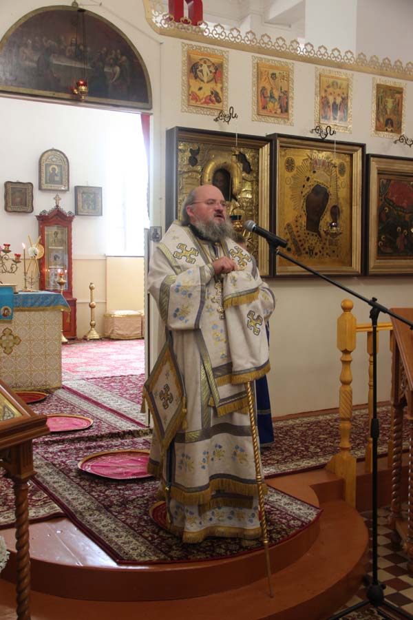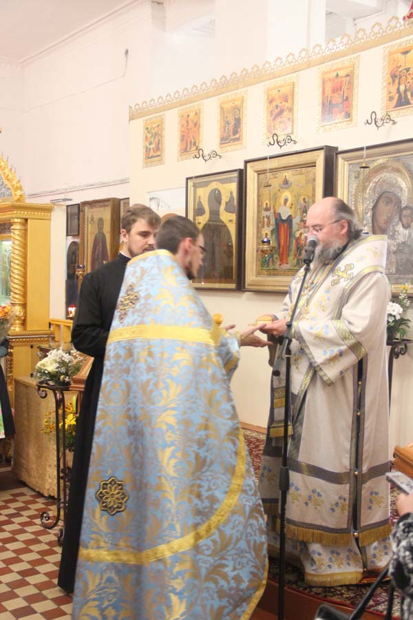 По окончании Божественной литургии владыка обратился к богомольцам с архипастырским словом, в завершении которого поздравил клирика собора иерея Алексия Сначева с годовщиной его иерейской хиротонии и преподнес ему просфору и памятный подарок.