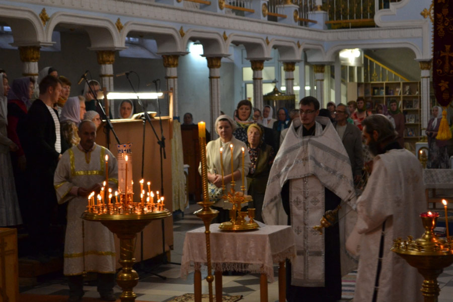 В Казанском кафедральном соборе г. Людиново в день двунадесятого праздника – Преображения Господня состоялись праздничное Всенощное бдение с литией, молебен с пением акафиста Преображению Господню и Божественная литургия.