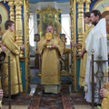 По отпусте литургии священнослужители в центре храма у праздничной иконы совершили славление, а затем владыка обратился к молящимся с проповедью.