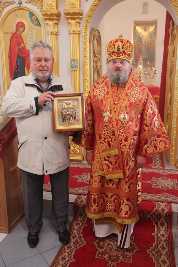 Архипастырь поздравил ктитора храма Анатолия Ивановича Петракова с семидесятилетием со дня рождения и преподнес ему в дар икону преподобных Оптинских старцев.