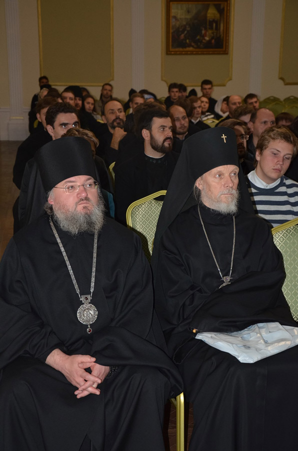 Далее выступил схиархимандрит Дамаскин, игумен монастыря пророка Илии в Фирах (Греция). Отец Дамаскин рассказал присутствующим об Афоне. Так же о святой горе Афон рассказал преподаватель КДС протоиерей Андрей Лобашинский.