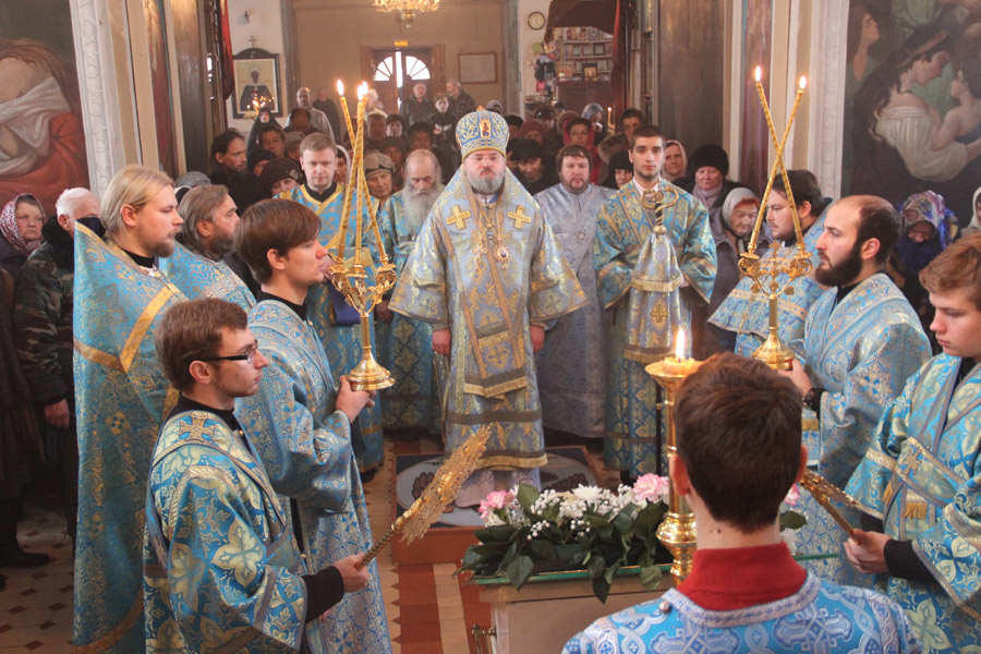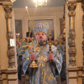 По отпусте литургии священнослужители совершили славление Божией Матери пред Ее празднуемым образом, а затем владыка обратился к богомольцам с проповедью.