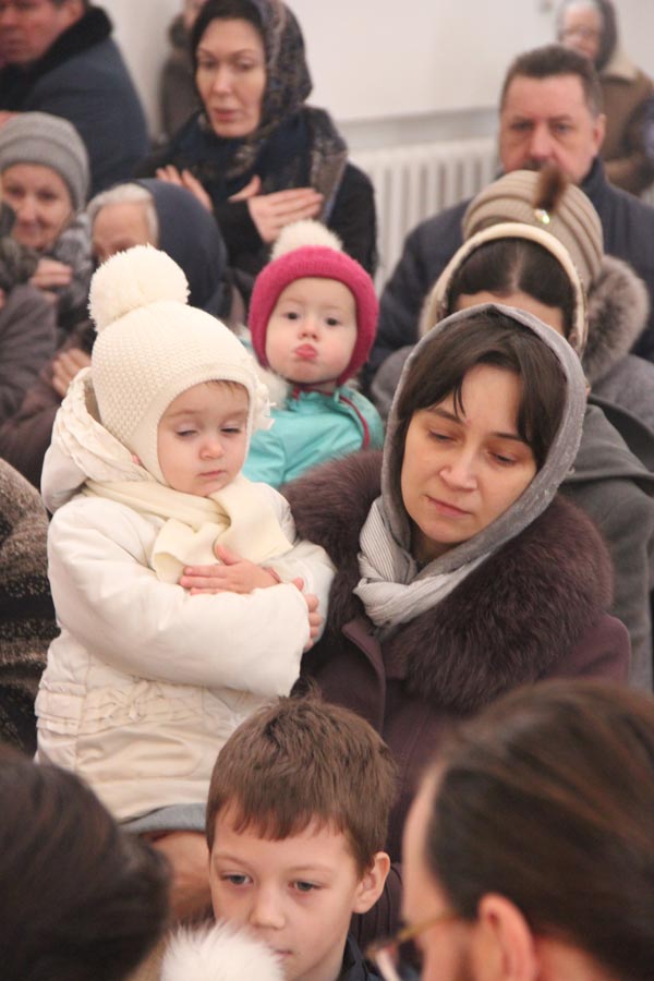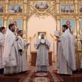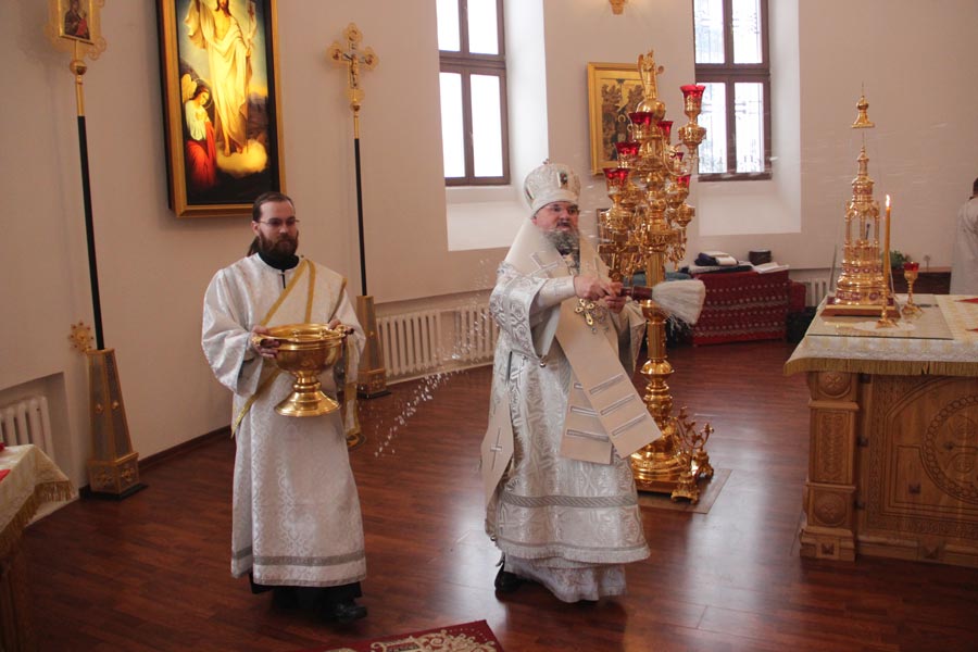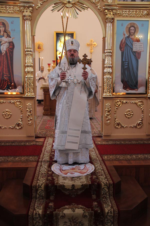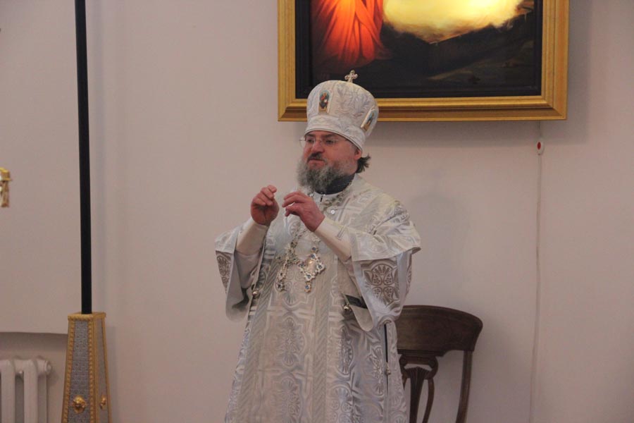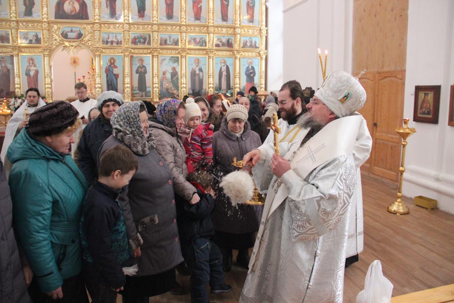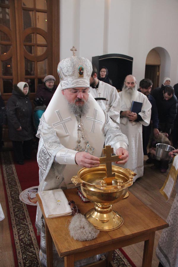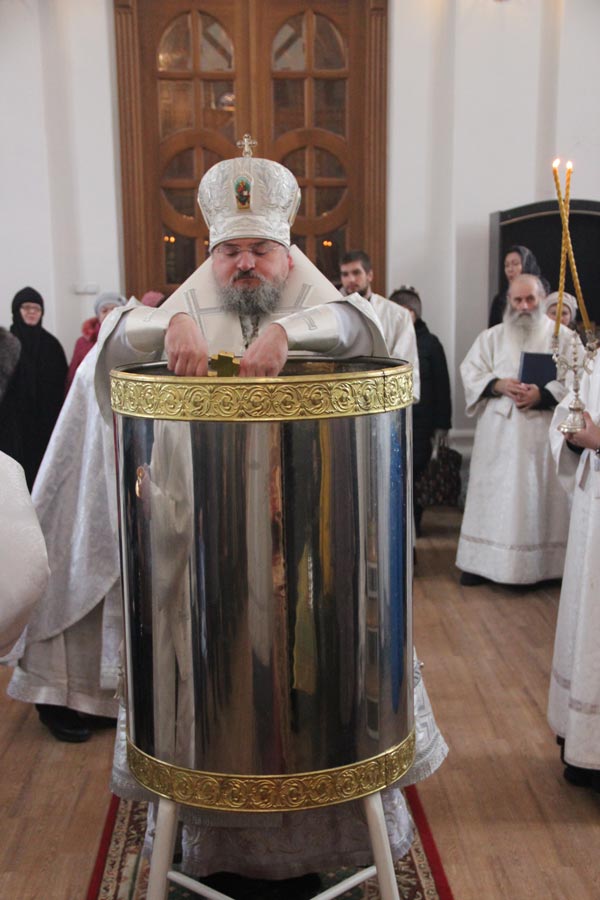 По заамвонной молитве священнослужители совершили великое освящение воды в завершении которого владыка обратился к богомольцам с архипастырским словом.