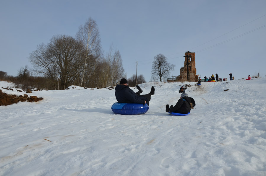 Дети катались на санках и резиновых «ватрушках» с огромной снежной горки, которую специально обустроили около ныне восстанавливающегося храма в честь Зачатия Пророка Иоанна Предтечи. Ребята маленькие и большие катались «наперегонки», строили снежные крепости, играли в снежки, лепили снеговиков. К воспитанникам школы присоединились и местные деревенские ребятишки. Довольны горкой остались не только дети, но и взрослые. Все, в том числе и батюшки, не отказались и сами прокатиться на «ватрушках».