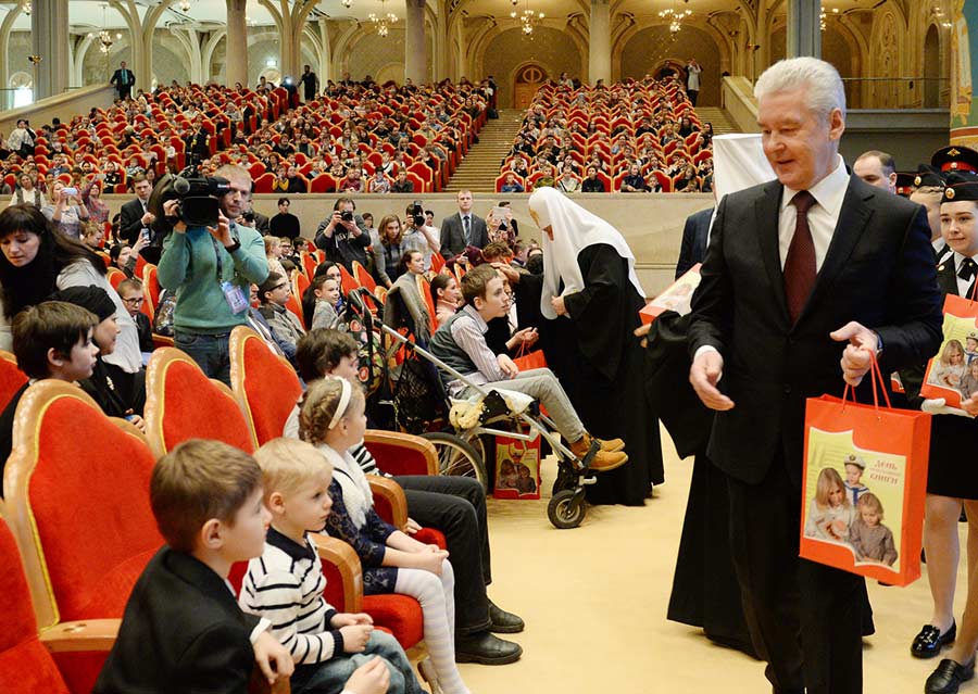 Предстоятель Русской Православной Церкви и мэр Москвы передали юным читателям подарочные наборы, в которые вошли книги, изданные православными издательствами и Правительством Москвы, и конфеты.