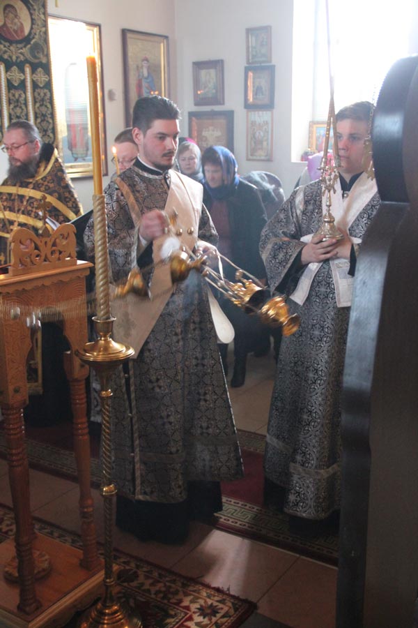Архипастырю сослужили: настоятель храма, благочинный округа протоиерей Иоанн Староста с клириками благочиния, а также иерей Виктор Носов, диакон Евгений Ковригин и диакон Евгений Васильев.