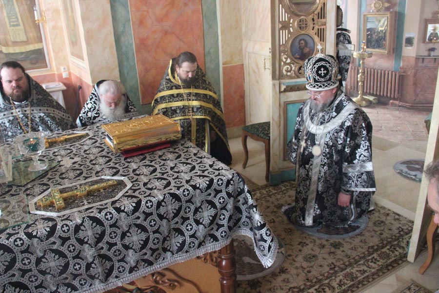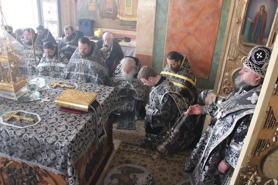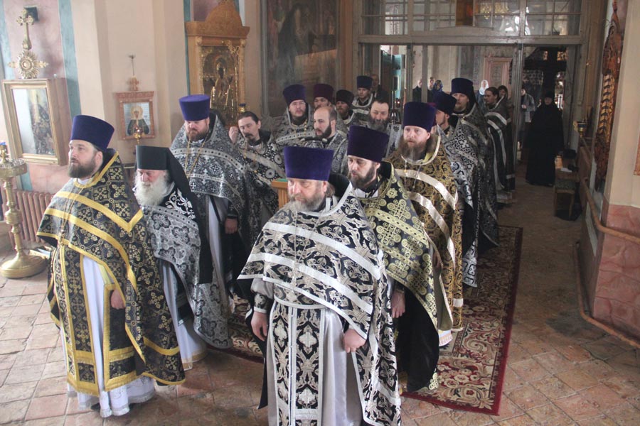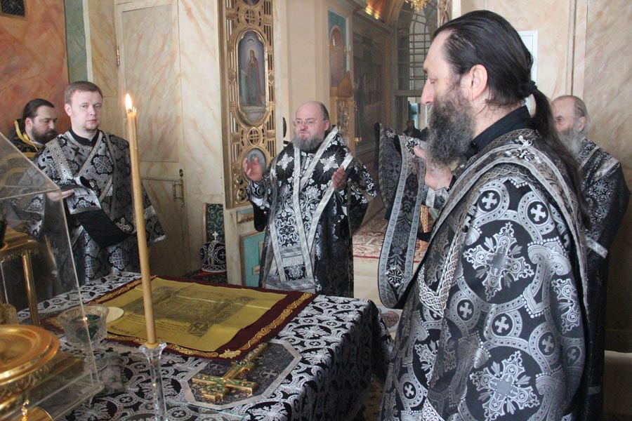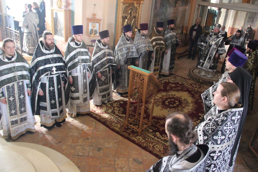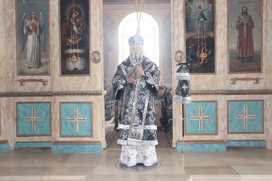 Архипастырю сослужили: секретарь епархии, благочинный округа протоиерей Владимир Бахаев, духовник епархии иеромонах Тихон (Клинов), клирики благочиния.