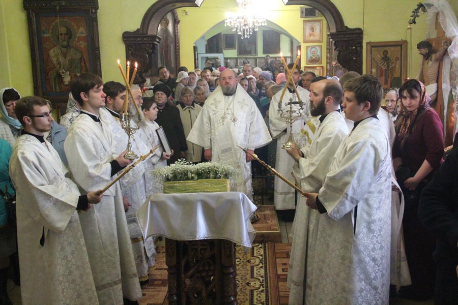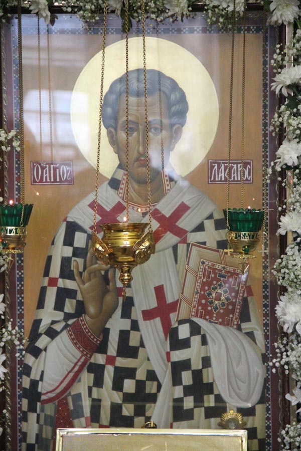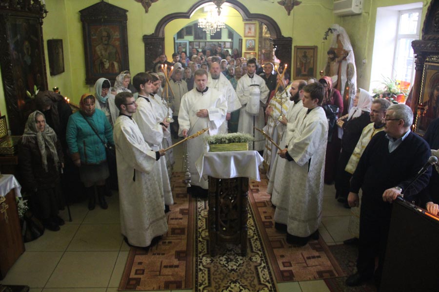 По отпусте литургии священнослужители, в центре храма, пред иконой праведного Лазаря, совершили славление праздника и заупокойную лития по всем почившим клирикам и прихожанам храма, являющегося городским кладбищенским храмом.