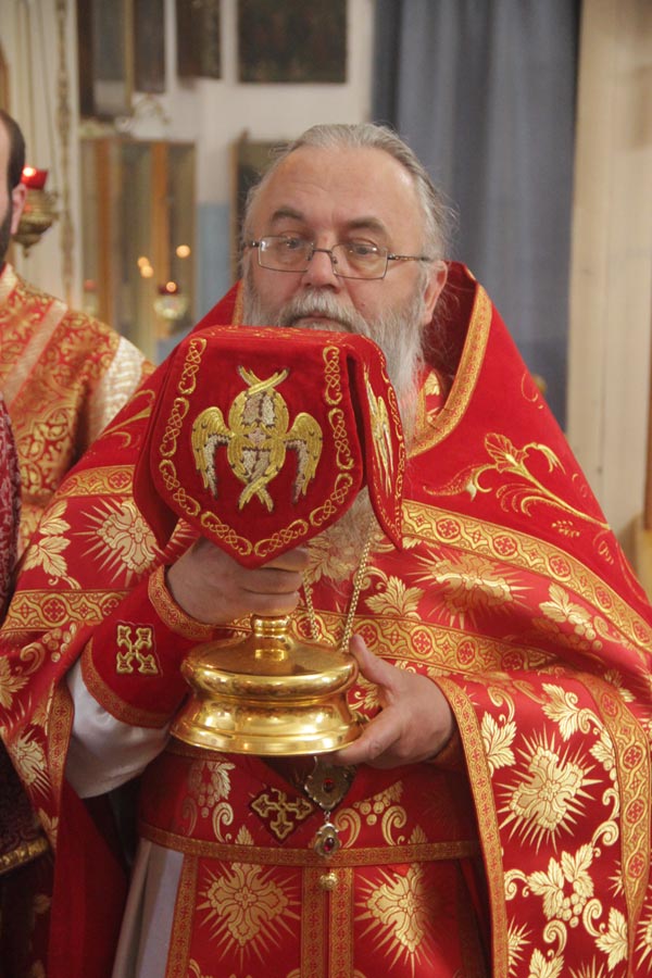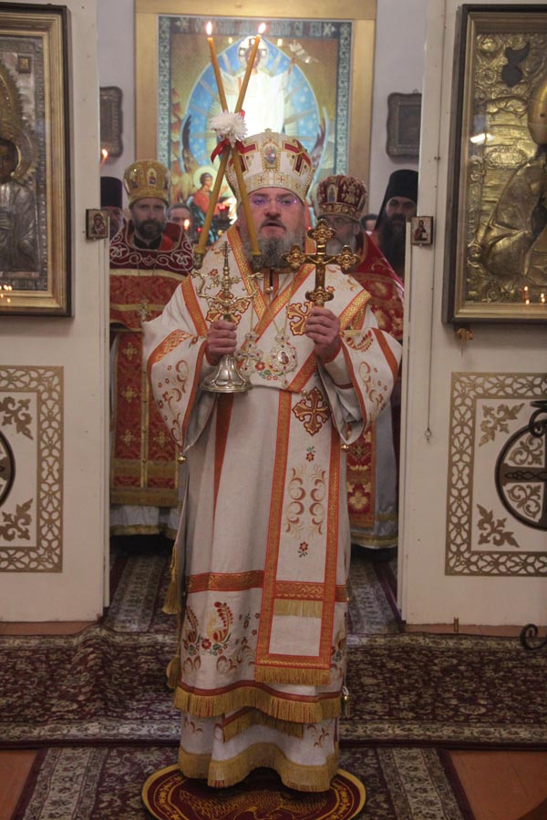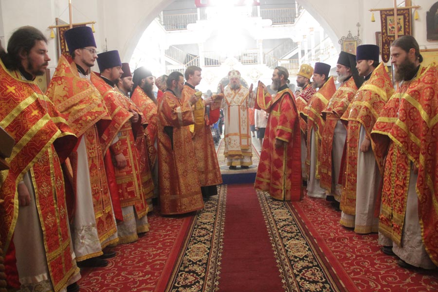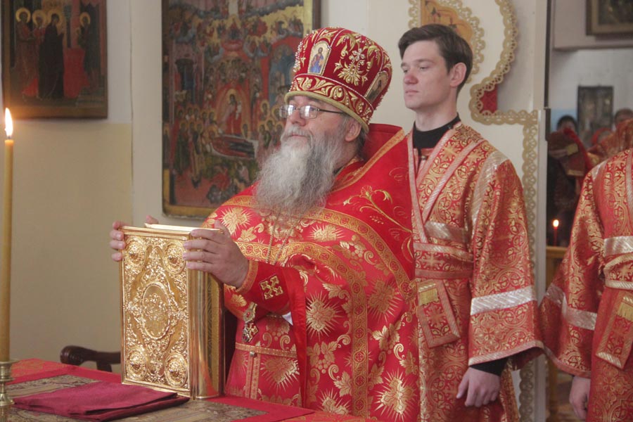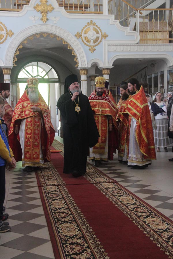 По отпусте литургии священнослужители совершили благодарственный молебен по окончании которого владыка обратился к богомольцам с проповедью.