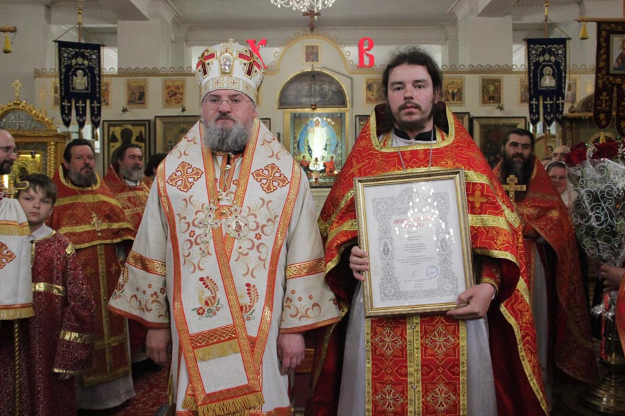 Архипастырь поздравил настоятеля собора протоиерея Алексия Жиганова с юбилейной датой – 25-летием со дня иерейской хиротонии и вручил ему медаль преподобного Тихона Калужского. Владыка также поздравил клириков епархии, отмечающих в текущем году памятные даты и вручил им Архиерейские грамоты: протоиерею Антонию Хатунцеву в связи с 10-летием иерейской хиротонии; иерею Алексию Сначеву и иерею Николаю Безручкину — в связи с 30 – летием со дня рождения.