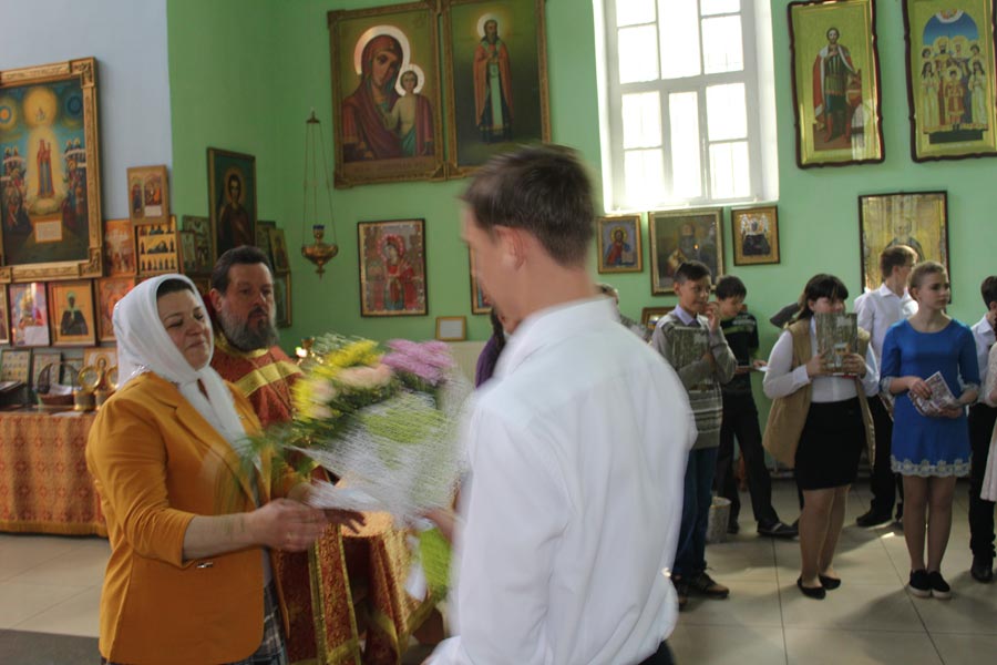 За тем, к ученикам и родителям с поздравлениями обратилась преподаватель школы Клячина Т.И. Она пожелала своим выпускникам оставаться православными христианами, быть преданными своему Богу и своему Отечеству. Выразила уверенность, что знания приобретенные детьми в стенах школы будут им полезны в жизни. Татьяна Ивановна призвала учеников не забывать посещать Богослужения, внимательно относиться к своему здоровью, к своим родителям. Пожелала помощи Божией во всех их делах и начинаниях.