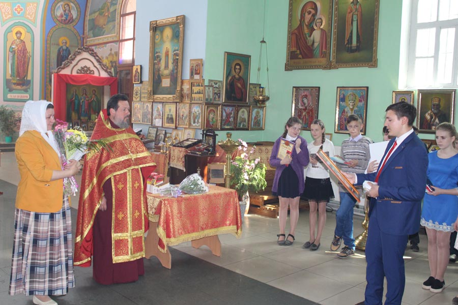 Подводя итоги учебного года батюшка поздравил лучших учащихся в истекшем учебном году и вручил им грамоты за отличные и хорошие успехи в учебе и активное участие в жизни школы. Пожелал всем хорошего отдыха, здоровья, помощи Божьей в летнем отдыхе, не забывать в летнее время о молитве и о посещении храма.