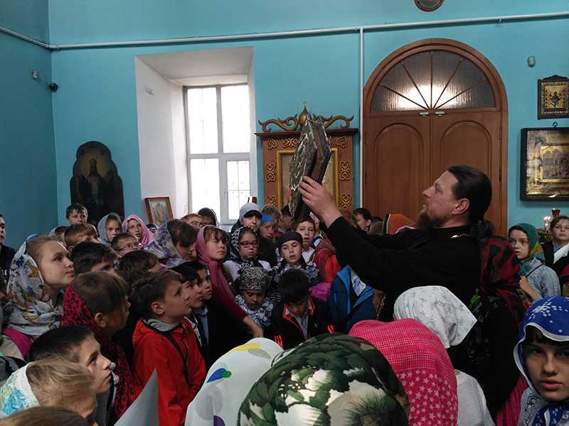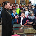 Панов С.А. преподаватель Воскресной школы провел экскурсию по храму. По окончании экскурсии ученикам была предложена беседа об истории письменности и книгопечатания на Руси. Ребята имели возможность подержать в руках, полистать и почитать старинные рукописные и печатные книги.