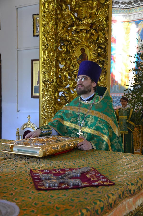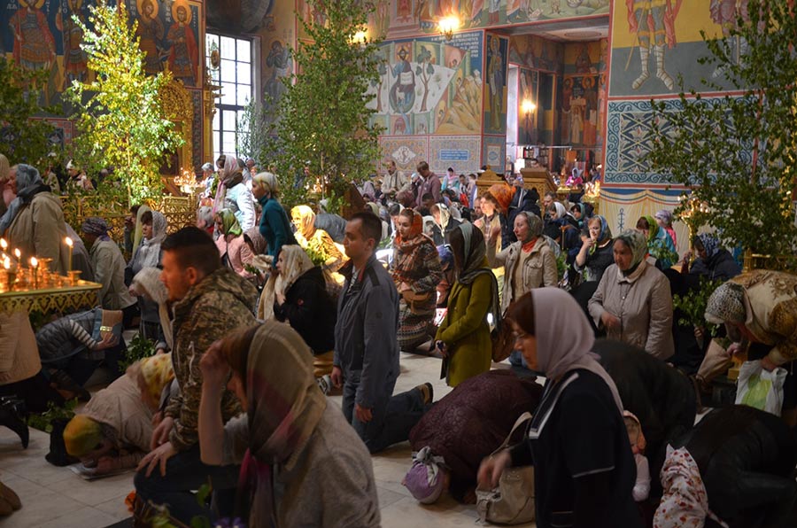 По завершении Литургии митрополит Климент, епископ Никита, епископ Серафим в сослужении духовенства совершили Великую вечерню с великим прокимном «Кто Бог велий..» и чтением коленопреклонных молитв.