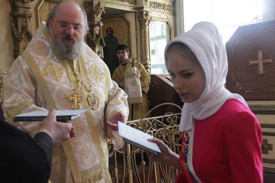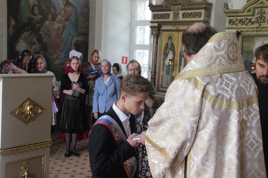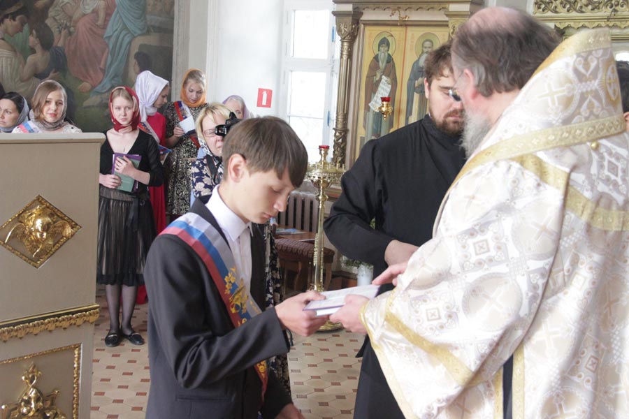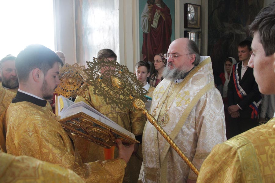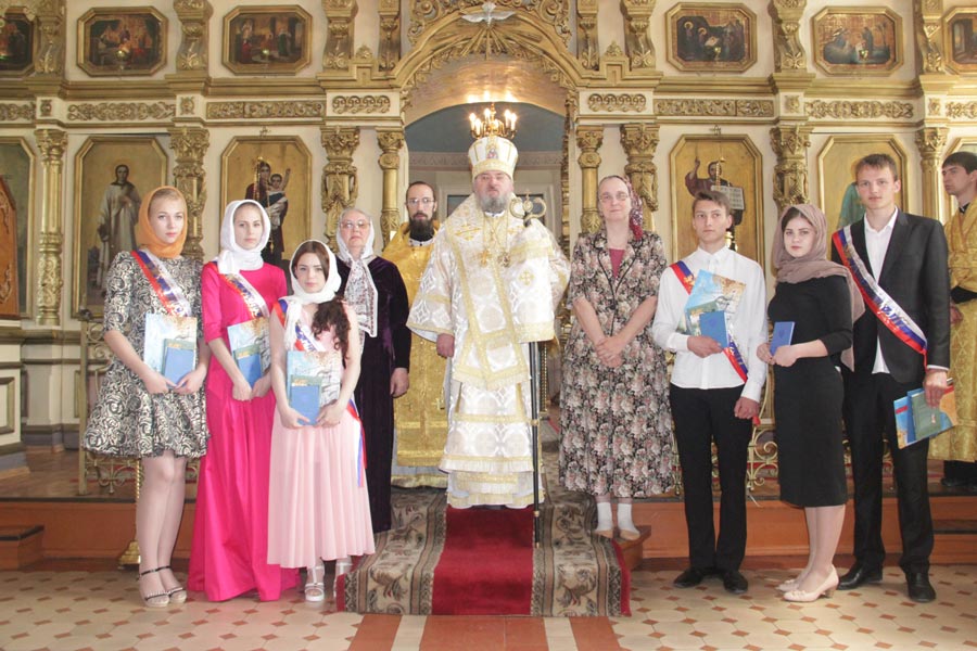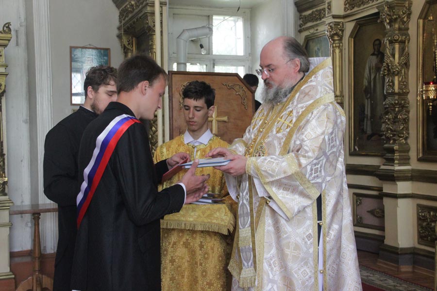 По окончании литургии, священнослужители совершили благодарственный молебен, в завершении которого владыка обратился к выпускникам с архипастырскими словом, поздравив всех с успешным окончанием обучения и вручил аттестаты.