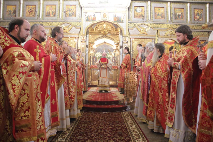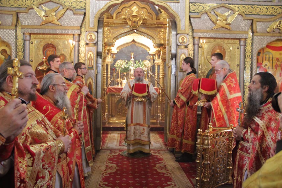 Архипастырю сослужили: наместник монастыря иеромонах Пафнутий (Архипов), наместник Свято-Тихоновой пустыни архимандрит Тихон (Завьялов), духовник Боровского монастыря схиархимандрит Власий (Перегонцев), протоиерей Алексий Жиганов, игумен Мефодий (Пронькин)-секретарь Калужского епархиального управления, клирики Калужской, Козельской и Московской епархий. По отпусте литургии священнослужители совершили благодарственный молебен и молебен святым Царственным Страстотерпцам, в завершении которого, вознеся молитву Господу Боду и святым венценосным страдальцам, епископ Никита обратился к богомольцам с проповедью.
