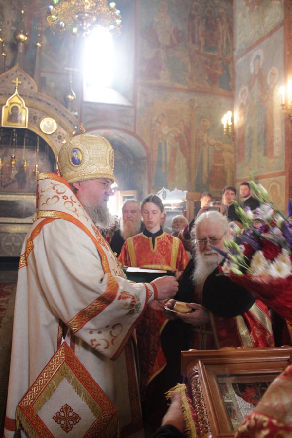 Архипастырь поздравил наместника монастыря иеромонаха Пафнутия (Архипова) с юбилеем – семидяситипятилетием со дня рождения и вручил ему награду — грамоту Святейшего Патриарха Московскогои всея Руси Кирилла. Владыка также огласил приветственный адрес митрополита Калужского и Боровского Климента и преподнес юбиляру святую просфору и иконы святого священномученика Кукши Киево-Печерского и Людиновской Пресвятой Богородицы.