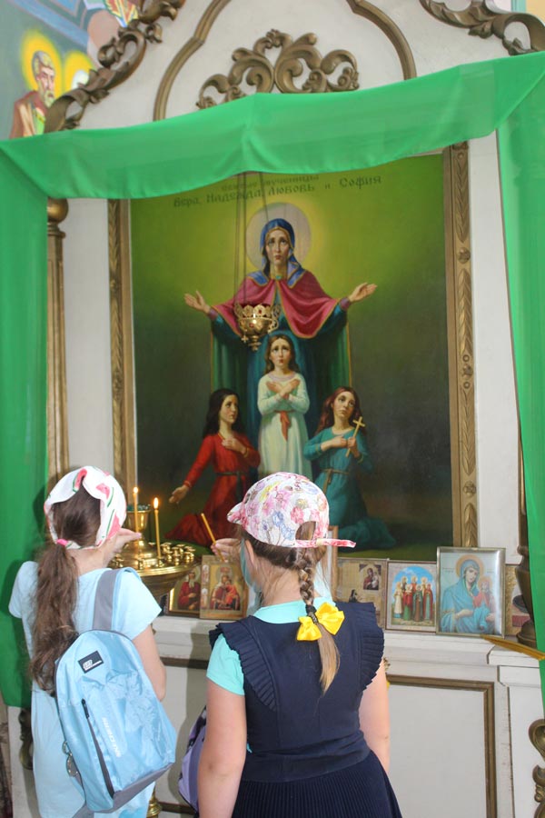 Преподаватель школы Клячина Татьяна Ивановна рассказала ребятам о храме, о правилах поведения в храме, за тем о житие святых мучениц Веры, Надежды, Любови и матери их Софии. В своем рассказе Татьяна Ивановна, обратила внимание детей на то, какую веру в Господа нашего Иисуса Христа имели эти девочки. Как стойко они претерпевали все муки и с радостью отдали свои жизни за Христа. За тем дети поставили свечи и приложились к святыням.
