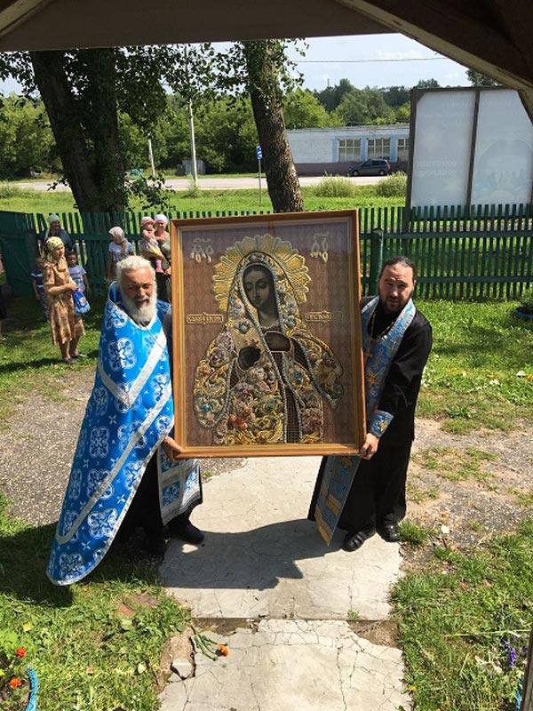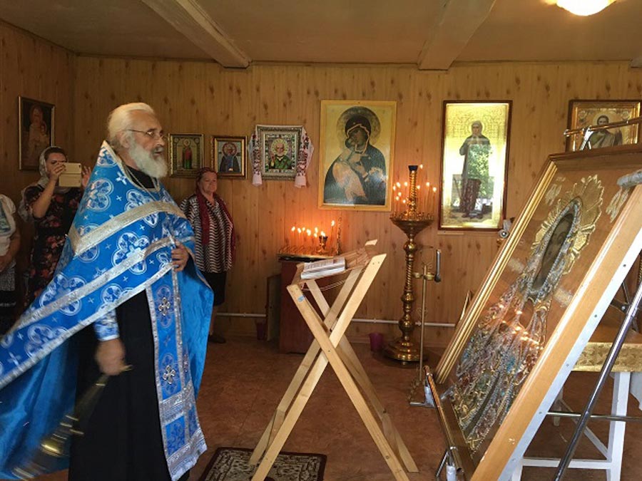 Первые Ее встретили в с. Дудоровский настоятель храма Казанской Иконы Божией Матери иерей Алексей Сорокин и благочинный протоиерей Максим Садовников.