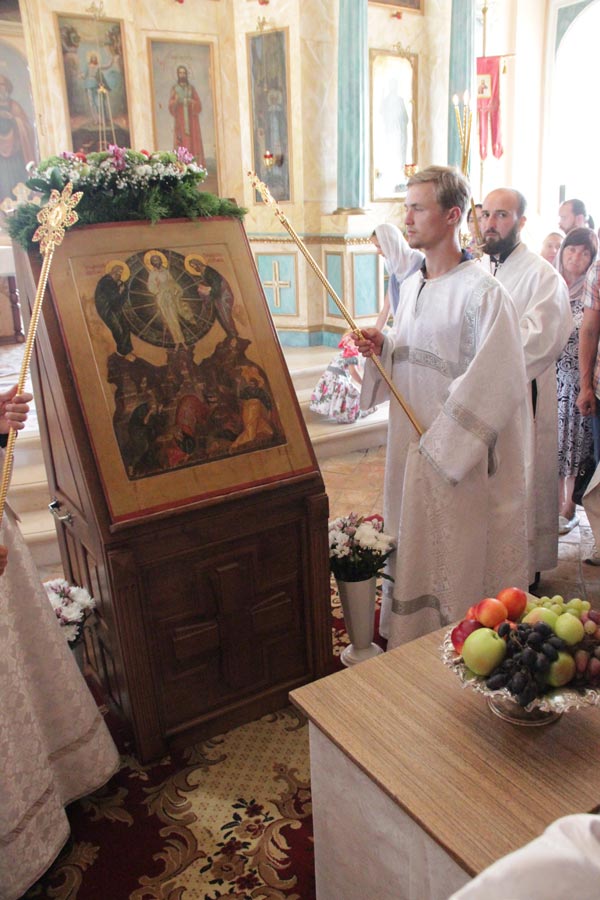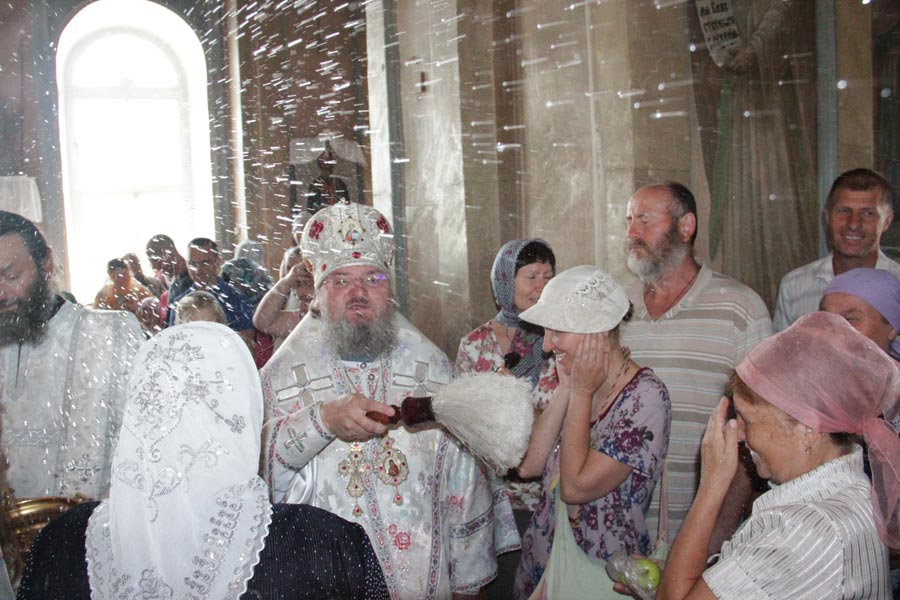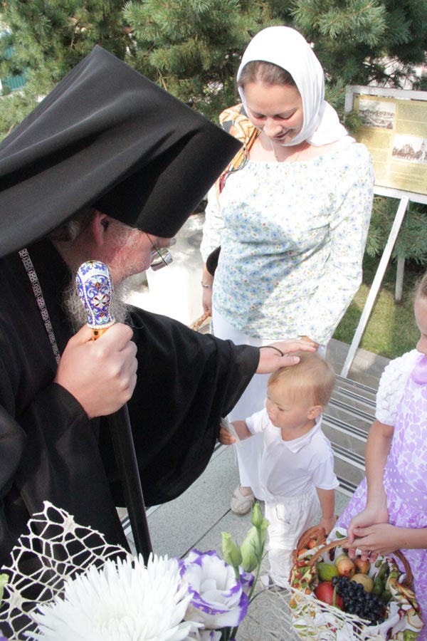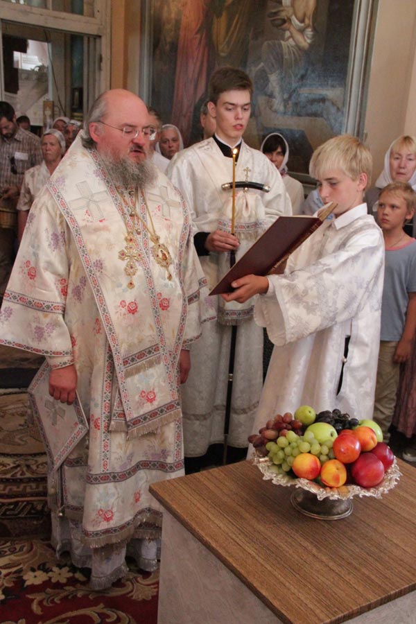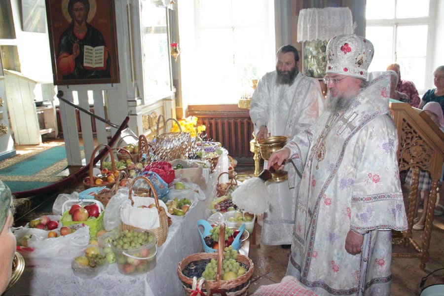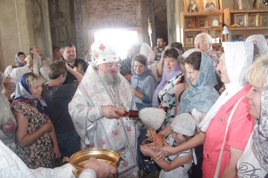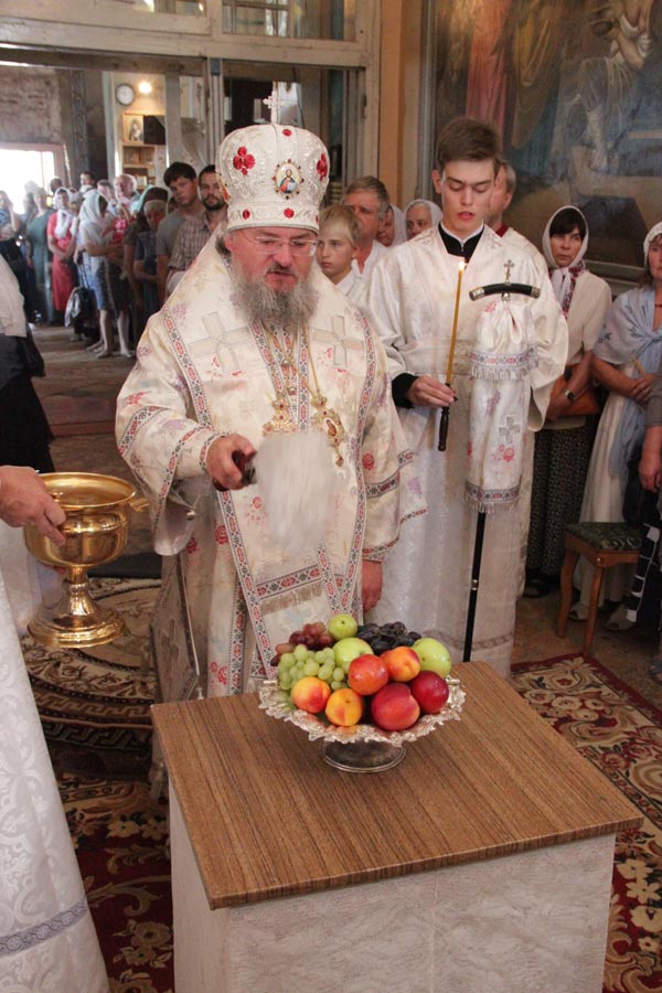 По заамвонной молитве владыка совершил освящение плодов нового урожая, а затем был совершен праздничный крестный ход вокруг храма в завершении которого архипастырь обратился к богомольцам с проповедью.