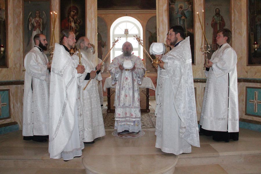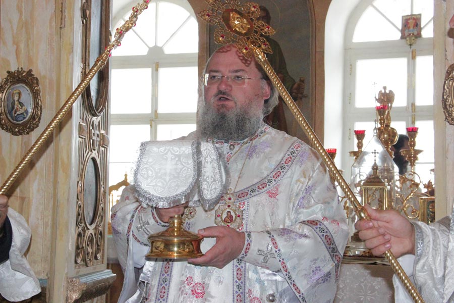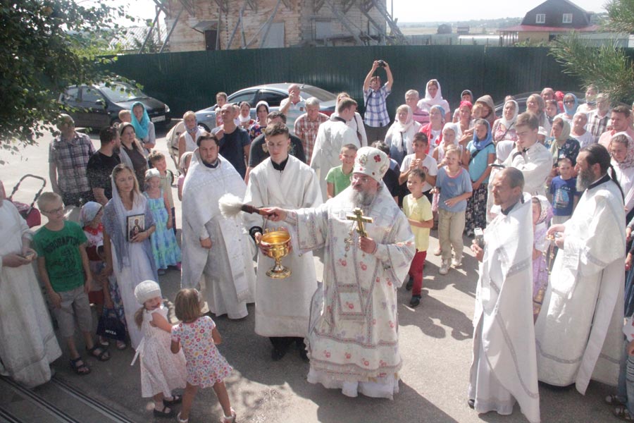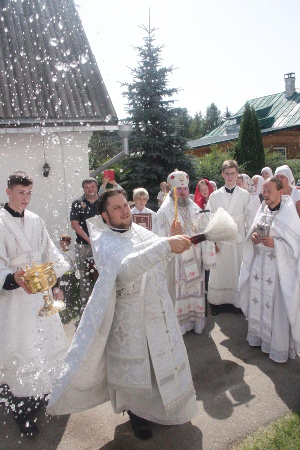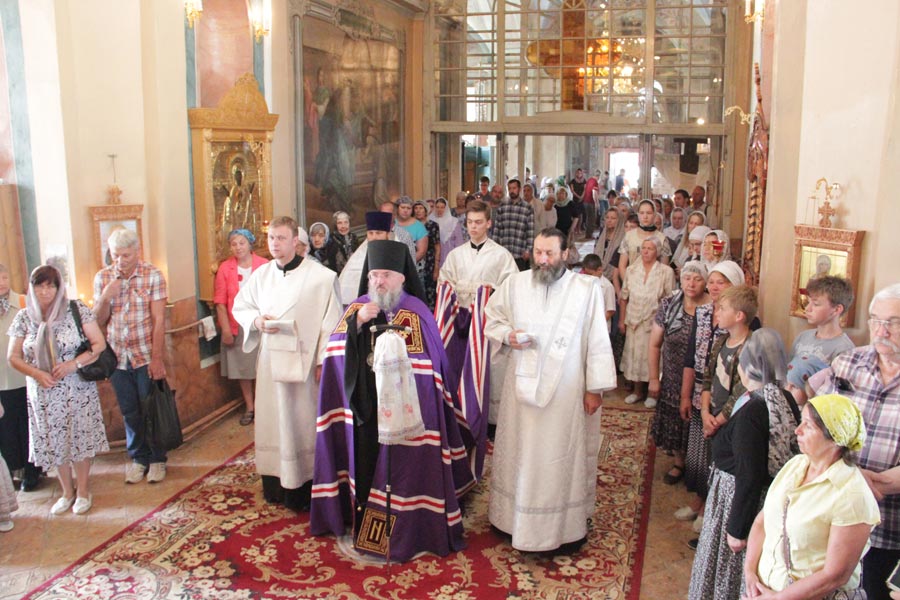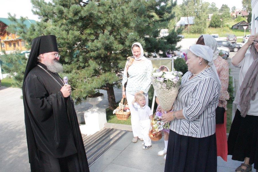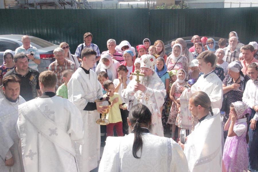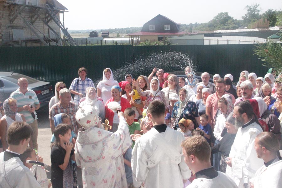 По заамвонной молитве владыка совершил освящение плодов нового урожая, а затем был совершен праздничный крестный ход вокруг храма в завершении которого архипастырь обратился к богомольцам с проповедью.