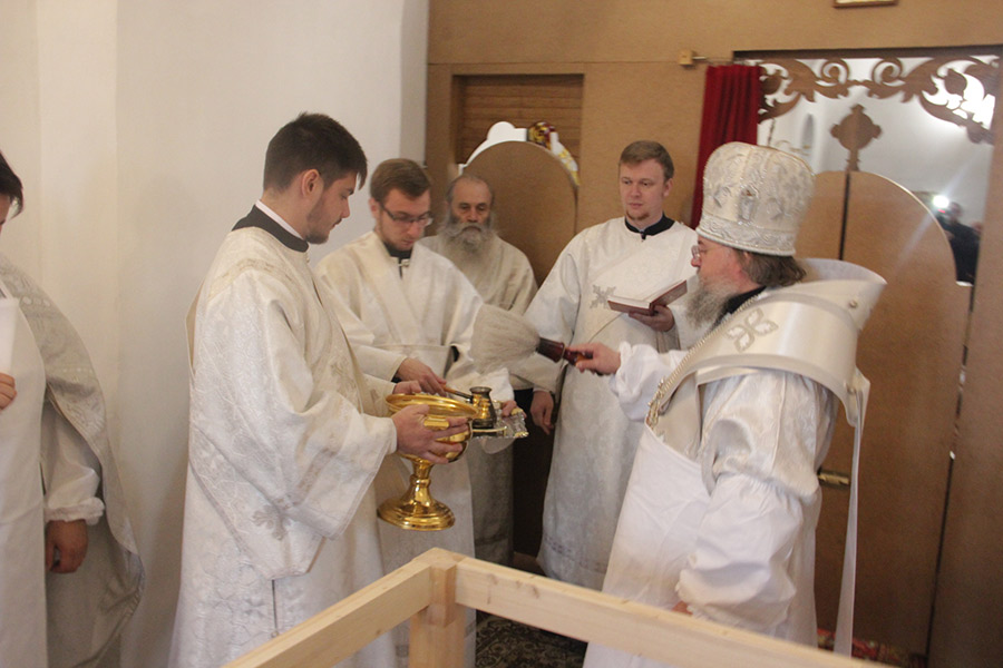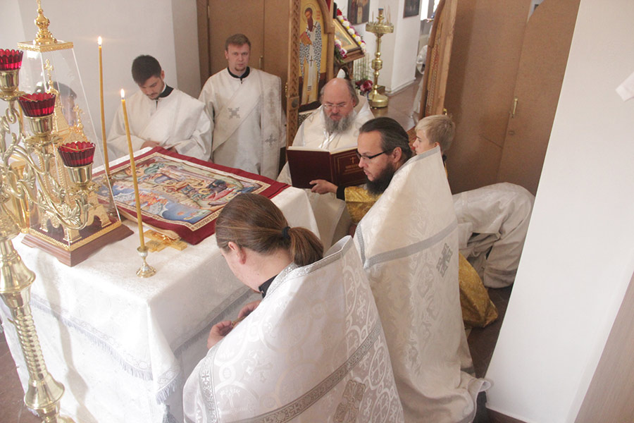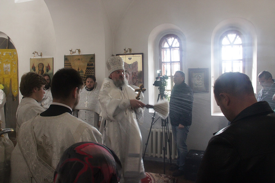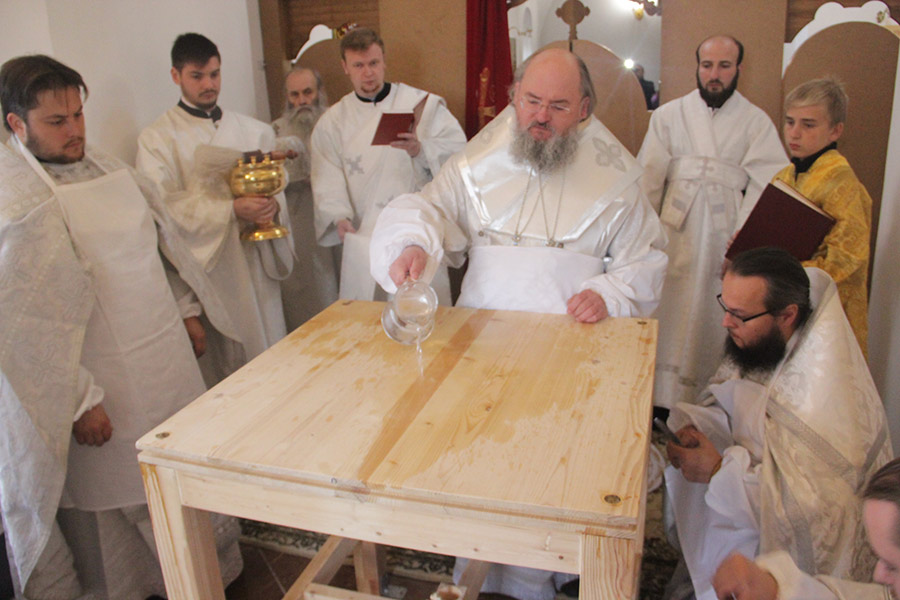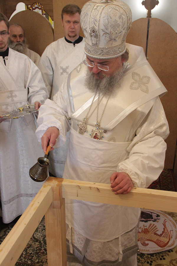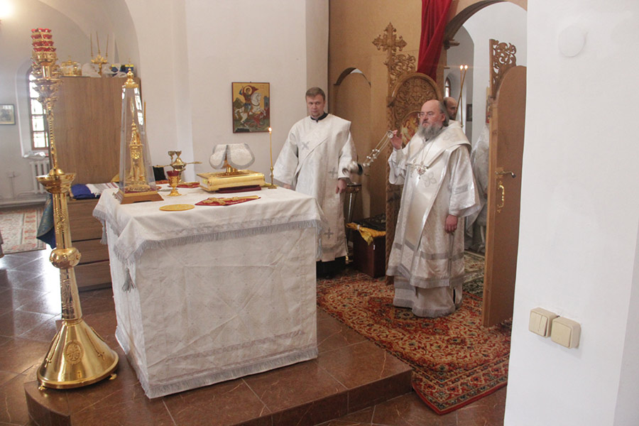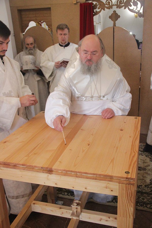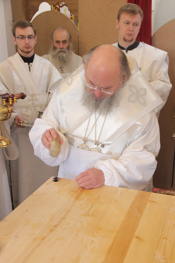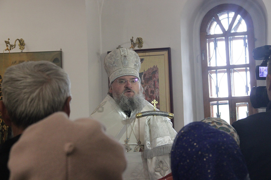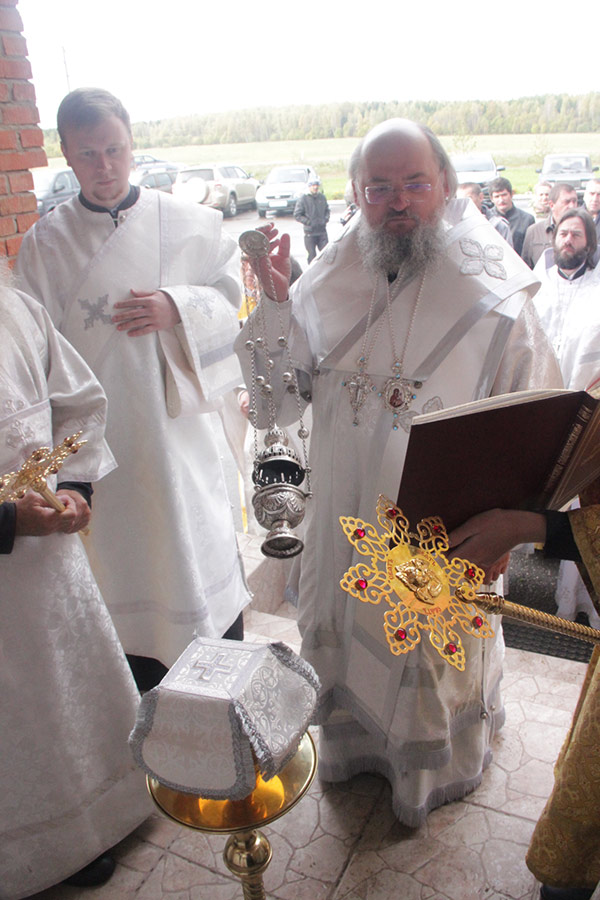 По освящении была совершена Божественная литургия. Архипастырю сослужили: протоиерей Антоний Хатунцев, иеромонах Паисий (Курмаз), иерей Антоний Демин – настоятель храма, иерей Виктор Носов, иерей Георгий Краснов, диакон Евгений Ковригин и диакон Евгений Васильев. По отпусте литургии владыка обратился к богомольцам с архипастырским словом.