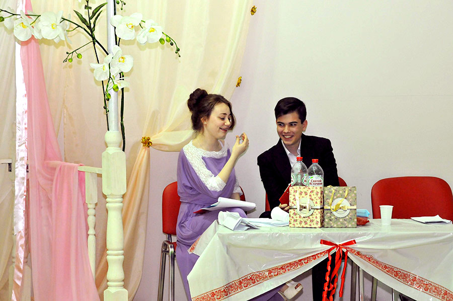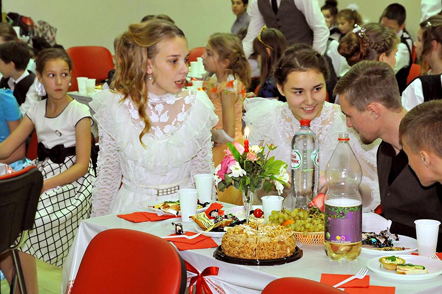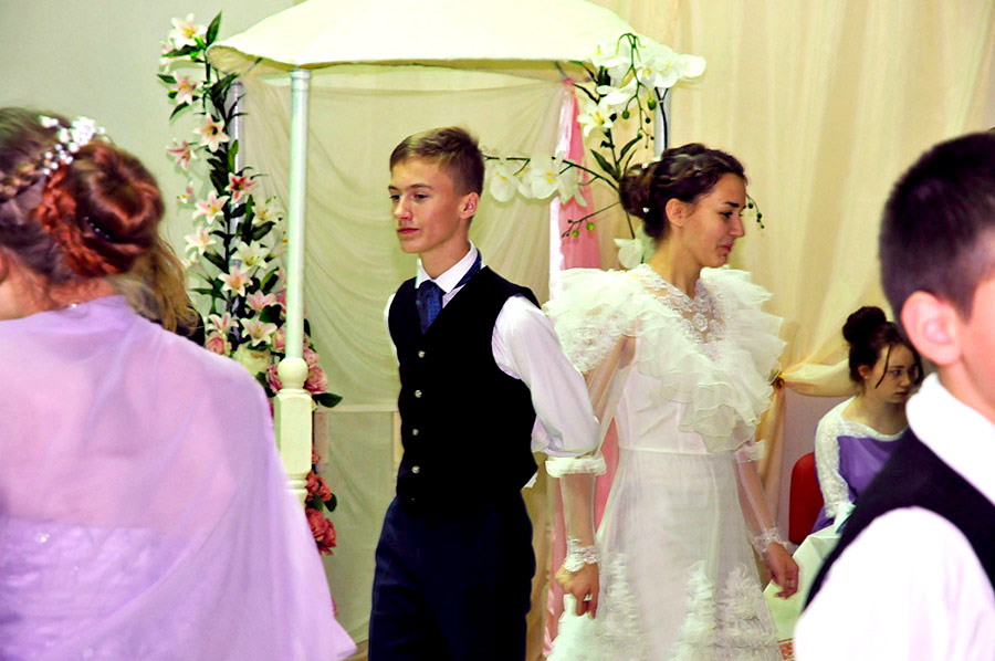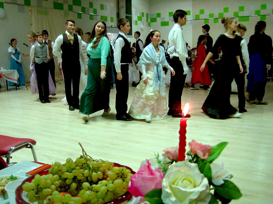 Были накрыты столы с угощением и напитками. На столах стояли цветы и свечи. Была оформлена выставка работ гимназистов.Среди приглашенныхгостей присутствовали: благочинный о.Владимир (Бахаев), священники и учителя, работавшие раньше в гимназии, представитель РОНО, выпускники гимназии, многодетные семьи гимназистов. Участниками бала были ученики гимназии с 4 по 11 класс. При этом ученики 4 класса принимали участие в балу впервые. Костюмы участников были праздничными. Дамы – в бальных платьях, кавалеры – в вечерних костюмах. Всего было приглашено около 90 человек, зал был полностью заполнен гостями, не осталось свободных мест не только за столами, но даже на стульях. Начался бал тожественным выходом танцующих пар под «Гранд-марш». После этого ведущие гимназисты 10 класса Юля Емельянова и Дима Сандросян зажгли свечи на столах. Затем последовала торжественная часть: приветственные слова и награждение гостей и учителей, перемежавшиеся концертными номерами.