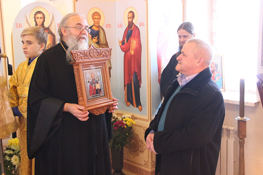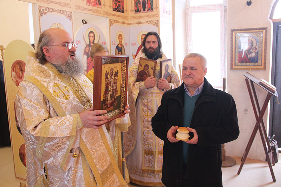 Архипастырь поздравил с днем тезоименитства ктитора храма Николая Николаевича Кленова и преподнес ему в дар икону Спасителя и святую просфору.