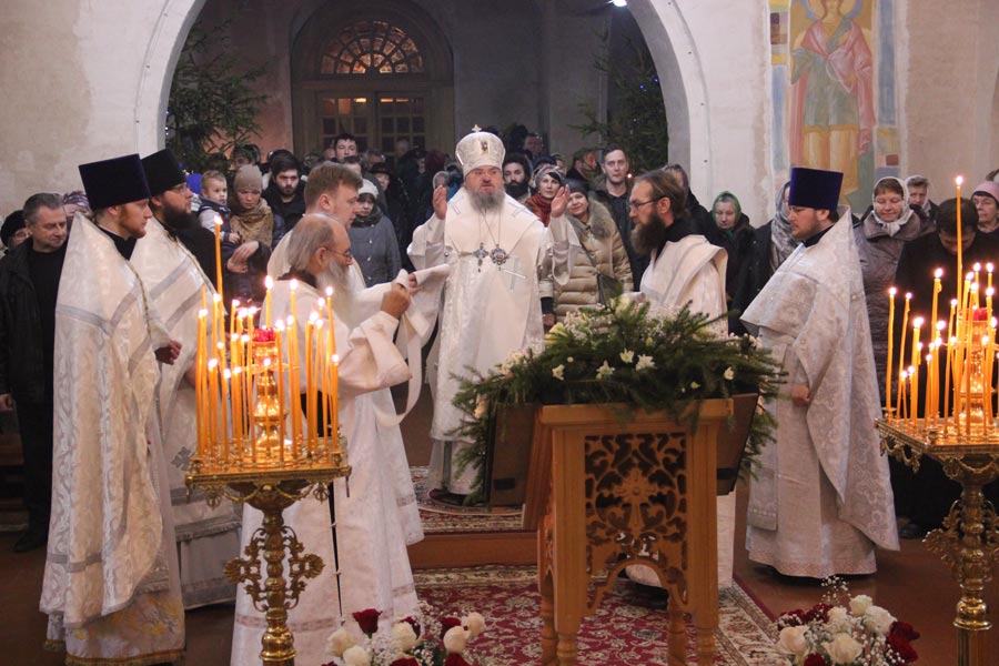 В день великого двунадесятого праздника Рождества Господа и Бога и Спаса нашего Иисуса Христа епископ Козельский и Людиновский Никита возглавил Божественную литургию в Успенском кафедральном соборе города Козельска.